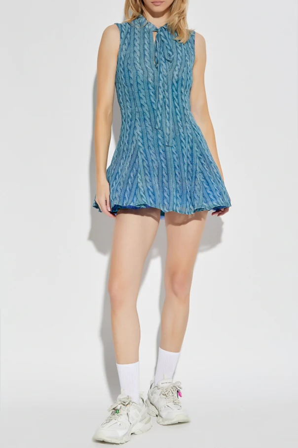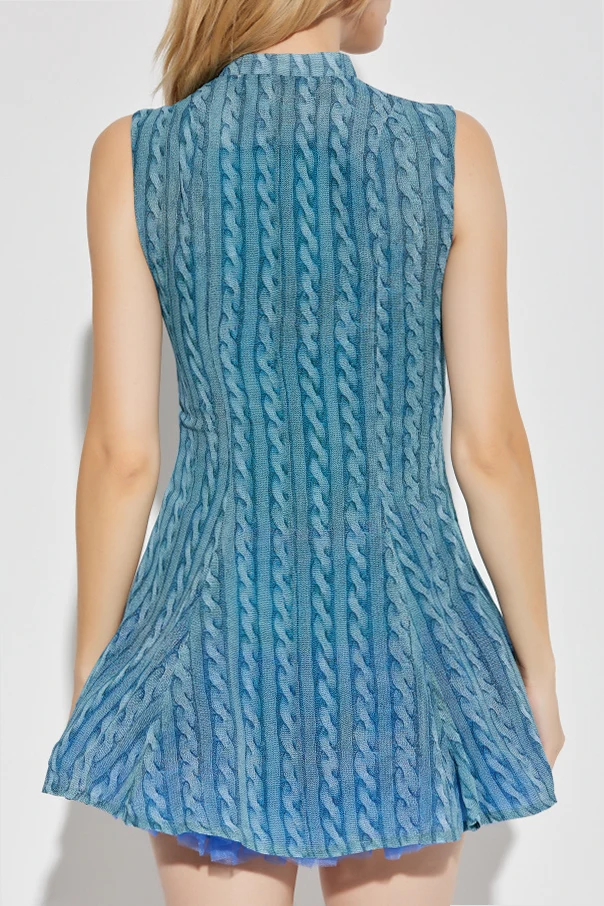 Niebieska sukienka bez rękawów to wyrafinowana propozycja domu mody AVAVAV , charakteryzująca się krótkim fasonem mini i rozkloszowanym dołem, który subtelnie podkreśla kobiecą sylwetkę. Strukturalny wzór imitujący splot warkoczowy, biegnący pionowo przez całą tkaninę, przywodzi na myśl artystyczną dbałość o detale i wprowadza efekt szlachetnej trójwymiarowości, dodając kreacji niepowtarzalnego wdzięku.