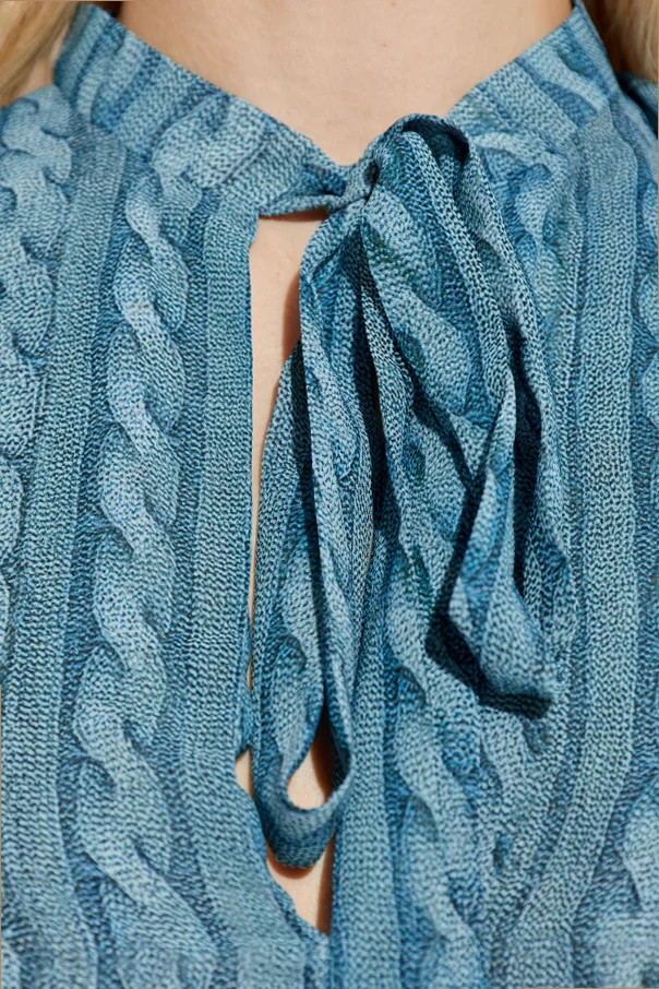 Lekki i elastyczny materiał, będący wyrazem mistrzowskiego wykorzystania nowoczesnego poliestru, harmonijnie łączy wygodę z luksusowym wyglądem, doskonale układając się na sylwetce. Stójka oraz delikatne wiązanie przy dekolcie, zakończone niewielkim rozcięciem, to wyrafinowane detale podkreślające zmysłowość i lekkość sukienki.