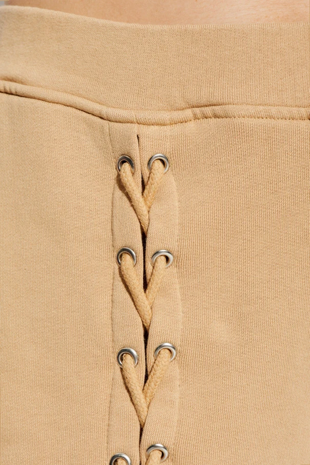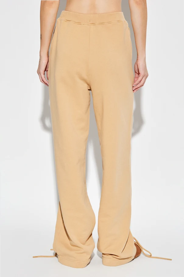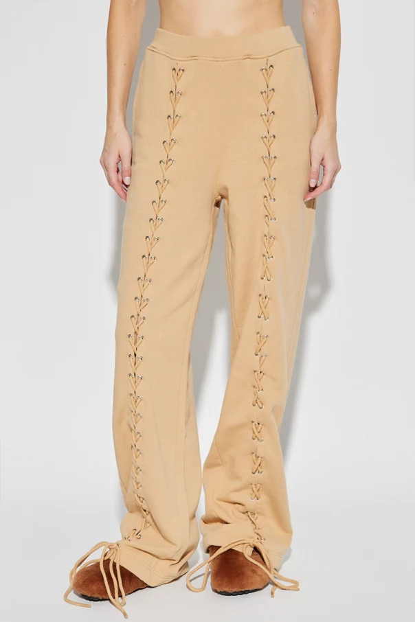 Najbardziej intrygującą cechą są szerokie pionowe przeszycia, zdobione efektownymi, metalowymi oczkami, przez które przeplatają się szerokie troki z identycznej dzianiny. Starannie wykończone troczki kończą się przy kostkach, nadając spodniom niezwykłą oryginalność. Szlachetna, miękka, matowa bawełna zapewnia aksamitną wygodę, a marka ROTATE gwarantuje niepowtarzalny styl inspirowany skandynawskim maksymalizmem.