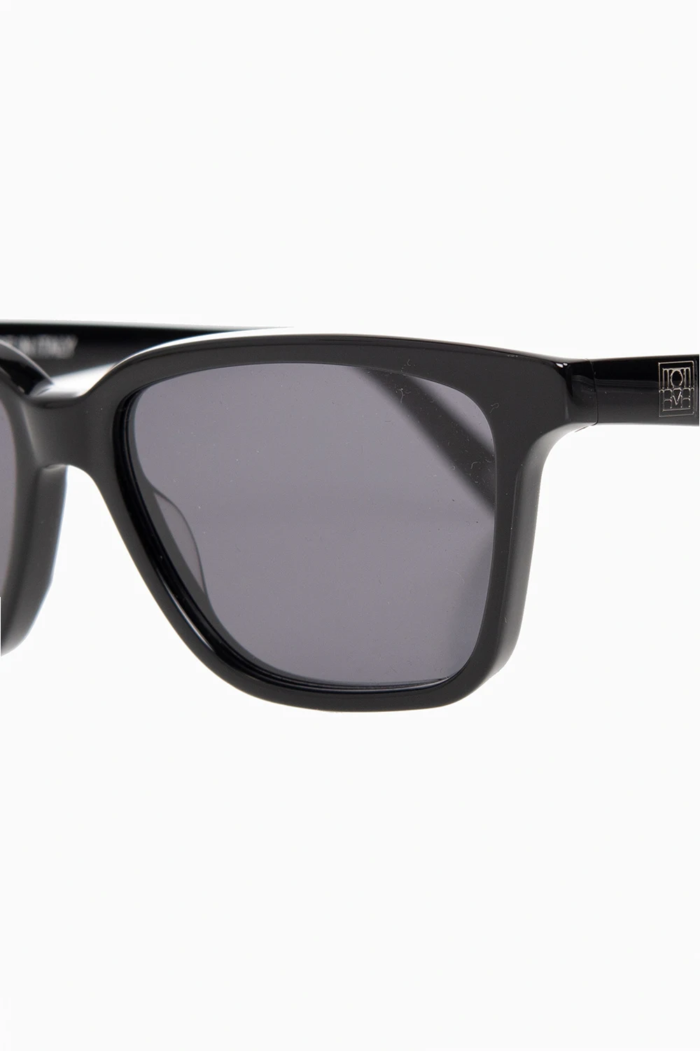 Czarne okulary przeciwsłoneczne, model ‘The Squares’ Toteme. Wykonane ręcznie we Włoszech z polerowanego acetatu. Kwadratowe oprawki. Zauszniki z wygrawerowanym logo. Szare soczewki chroniące przed promieniowaniem UV. Dołączone kaszmirowe etui z wyszytym logo w kolorze brązowym.