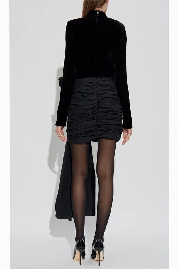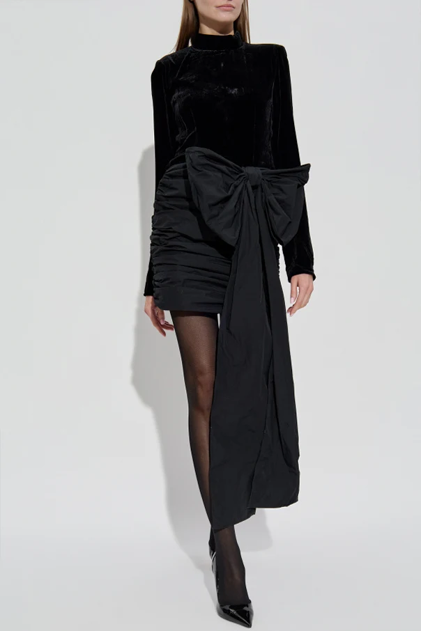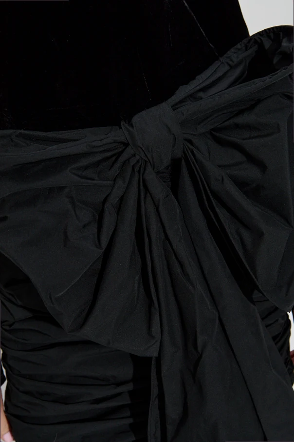 Góra sukienki została uszyta z gładkiego, delikatnie połyskującego weluru, natomiast dół wyróżnia się finezyjnym, warstwowym marszczeniem z satynowym lub technicznym wykończeniem. Szczególnego uroku całości dodaje efektowna, asymetrycznie umieszczona kokarda wykonana z matowej tkaniny technicznej, będąca niezwykle eleganckim zwieńczeniem projektu.