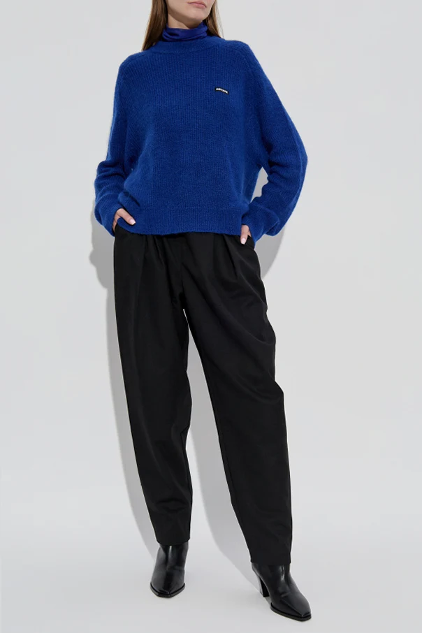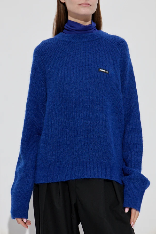 Sweter z naszywką z logo marki ROTATE emanuje subtelnym szykiem skandynawskiej awangardy, zachwycając niebieskim odcieniem oraz wyjątkowo miękką, puszystą strukturą dzianiny. Starannie dobrana kompozycja wysokogatunkowej przędzy, z wyczuwalną domieszką moheru i wełny, zapewnia ciepło oraz eleganckie wykończenie na najwyższym poziomie.