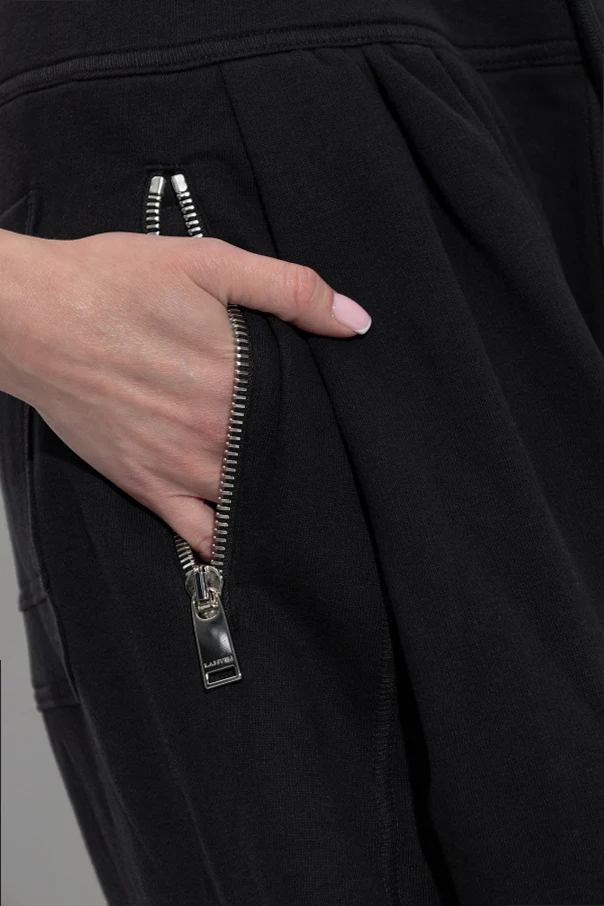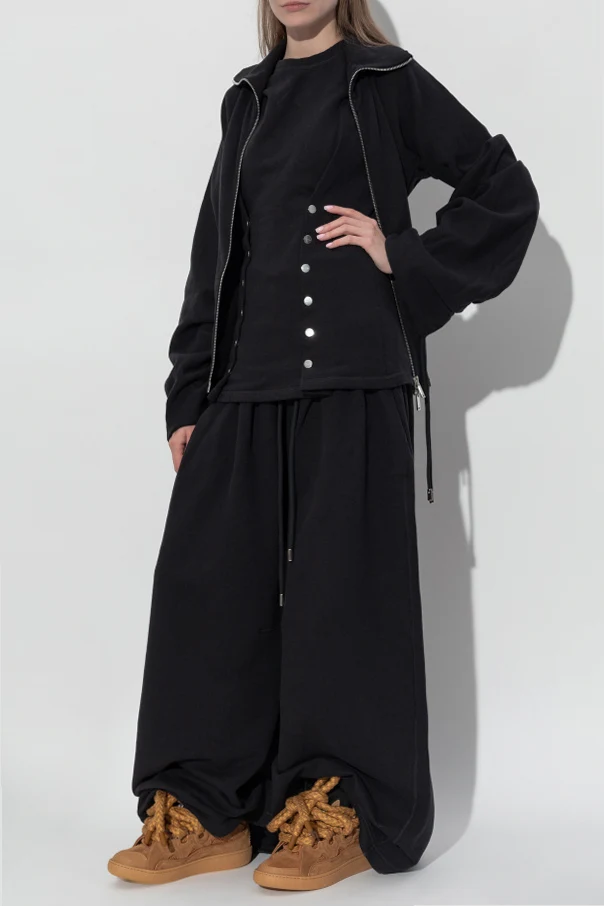 Projekt wyróżnia szeroki, elastyczny pas z regulacją przy pomocy sznurka ze szlachetnymi, metalowymi zakończeniami, a także praktyczne kieszenie z przodu, gwarantujące wygodę użytkowania. Minimalistyczna estetyka i brak zbędnych ozdób harmonizują z duchem ponadczasowego szyku, który od zawsze stanowi o renomie domu mody Lanvin .