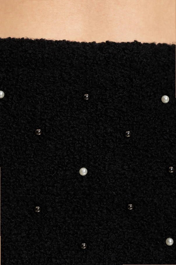 Szlachetne wykończenie i starannie rozmieszczone subtelne aplikacje, imitujące perły oraz drobne czarne koraliki, nadają tej spódnicy wyjątkowej elegancji i wieczorowego charakteru. Sam materiał, będący szlachetnym połączeniem wełny i subtelnego nylonu, gwarantuje nieskazitelny wygląd oraz komfort noszenia. Minimalistyczne obszycia podkreślają luksusowy charakter projektu, czyniąc z tej propozycji niepowtarzalny element garderoby.