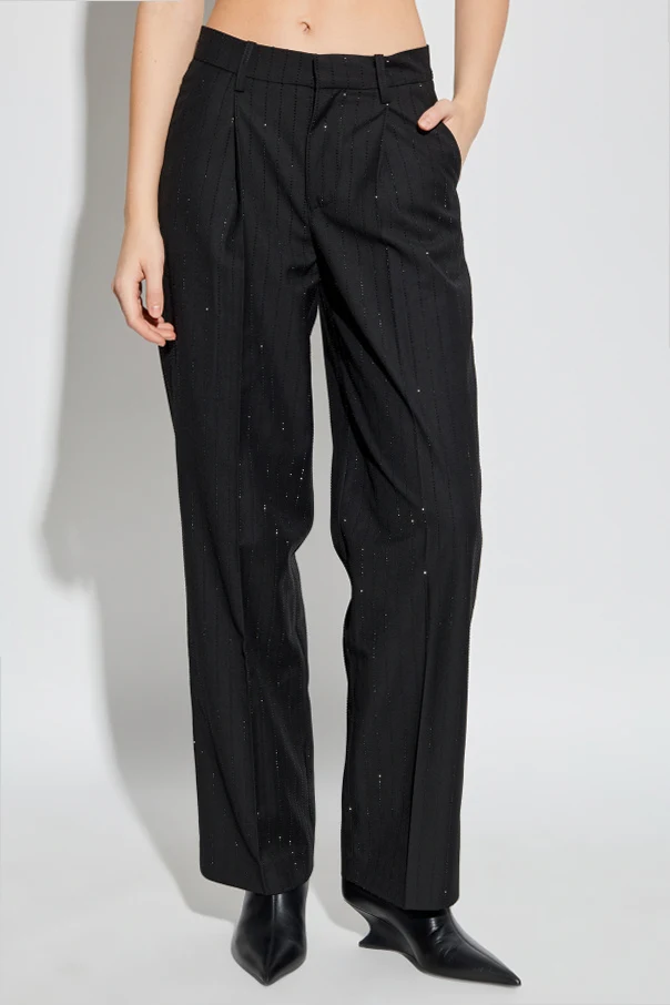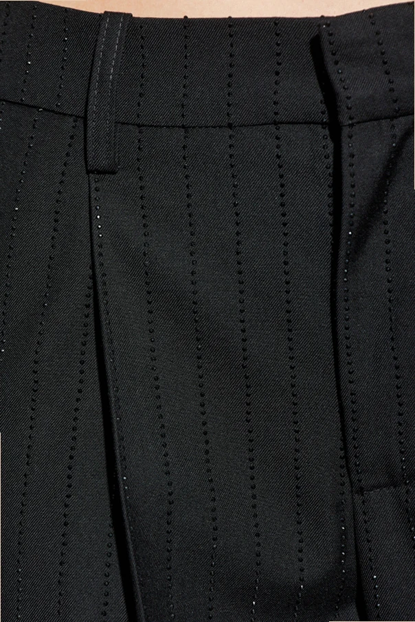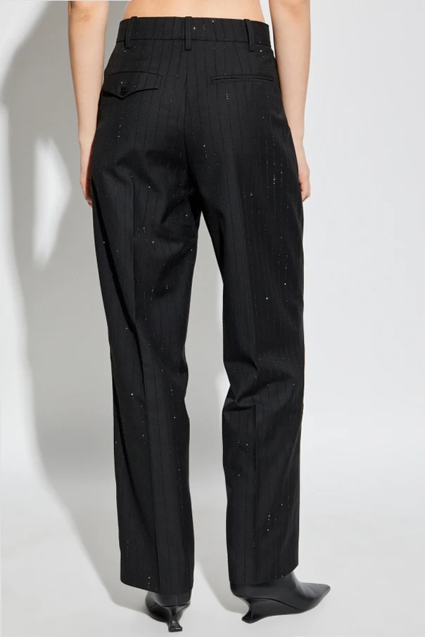 Spodnie przyciągają uwagę subtelnym pionowym wzorem w formie połyskujących pasków, które kunsztownie podkreślają całą sylwetkę. Doskonałe krawiectwo widoczne jest w dopracowanych detalach : lekko podwyższony stan, szerokie szlufki, zaprasowane kanty oraz klasyczne zaszewki zapewniają znakomite dopasowanie i wygodę noszenia. Staranne wykończenie to hołd dla tradycji haute couture, jednocześnie wpisując się w styl paryskiej nonszalancji.
