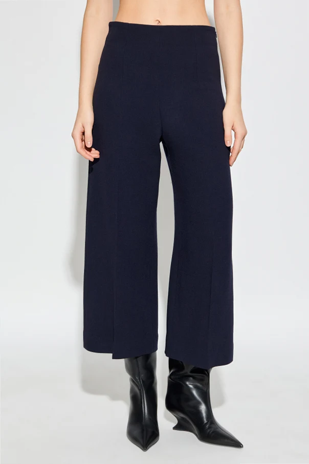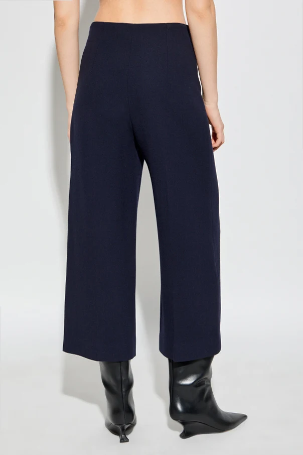 Spodnie z szerokimi nogawkami w kant marki Marni to kwintesencja nowoczesnej elegancji w ekskluzywnym wydaniu. Kunsztownie skrojone na wysokiej talii, wyróżniają się bardzo szerokimi, prostymi nogawkami o modnej długości 7/8. Brak widocznych szlufek, kieszeni i ozdobnych przeszyć nadaje projektowi ponadczasową, minimalistyczną formę, podkreśloną wyraźnie zaznaczonym kantem.