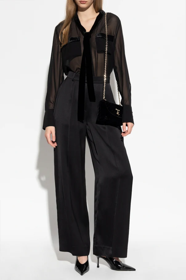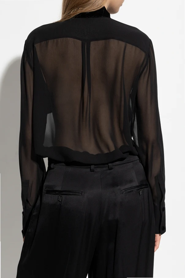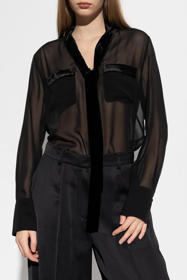 Zjawiskowe akcenty w postaci aksamitnych wykończeń zdobią patki dwóch przednich kieszeni na piersi i wiązanie przy kołnierzu, które subtelnie nawiązuje formą do szala lub stylowego krawata. Wąski, częściowo stojący kołnierz oraz mankiety wykończone kontrastującym, czarnym aksamitem podkreślają ekskluzywny charakter koszuli.