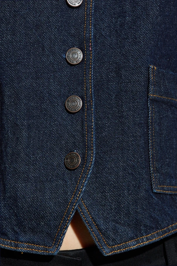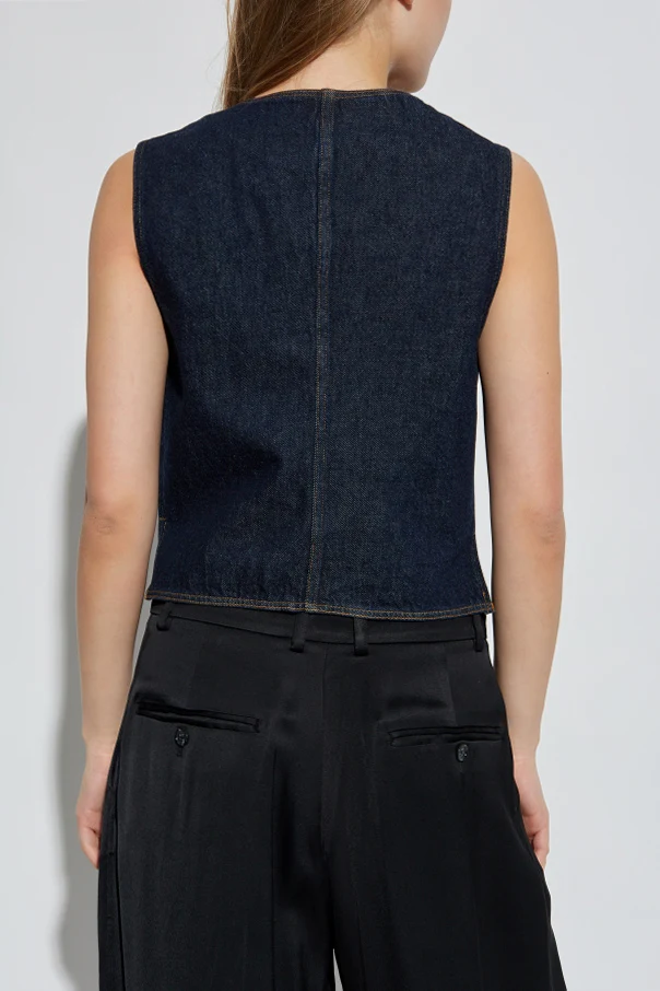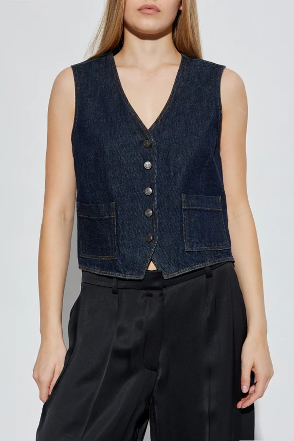 Prezentowana jeansowa kamizelka marki FRAME przykuwa uwagę swoim wysublimowanym charakterem. Uszyta z wysokogatunkowego denimu w jednolicie granatowym odcieniu, zachwyca subtelnym, prostym krojem z delikatnym taliowaniem, sięgającym do pasa. Linię kamizelki podkreśla wyraziste wcięcie na dolnym brzegu, nadając całości wyjątkową elegancję.
