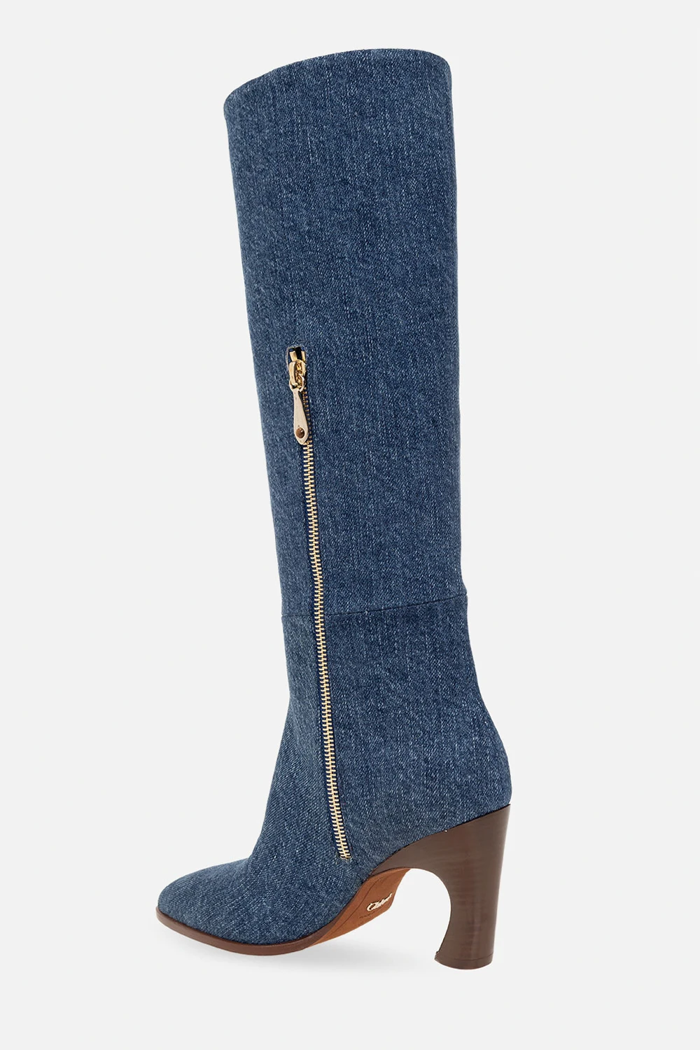 Ciemnoniebieskie kozaki na obcasie, model ‘Oli’ Chloé. Wykonane z jeansu. Z boku zapinane na zamek w kolorze złotym. Nosek w szpic. Brązowy dekoracyjny obcas. Brązowa, skórzana podeszwa.