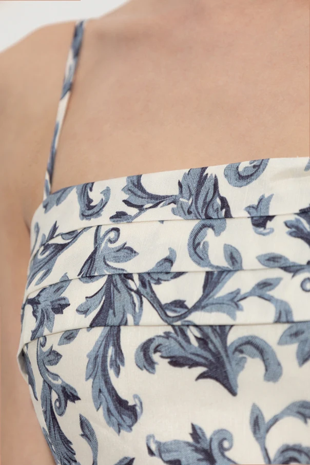 Na szczególną uwagę zasługuje wytworny, kremowo-niebieski florystyczny wzór o ornamentalnym stylu vintage, regularnie rozmieszczony na gładkiej, delikatnie połyskującej powierzchni tkaniny. Warstwa wierzchnia została wykonana z królewskiego połączenia lnu i jedwabiu, zaś przyjemna w dotyku podszewka została uszyta z naturalnej bawełny, co gwarantuje komfort noszenia nawet w upalne dni.