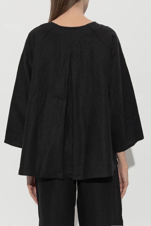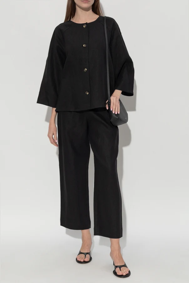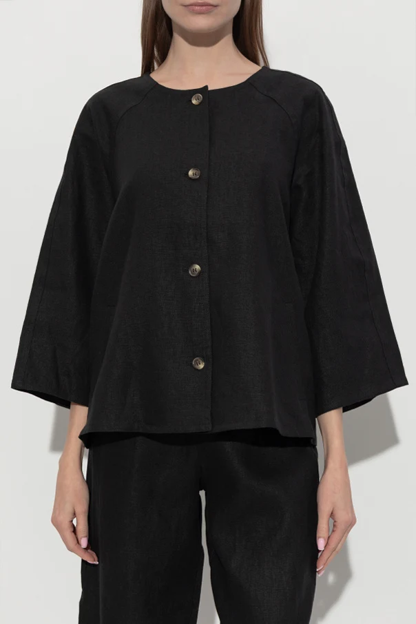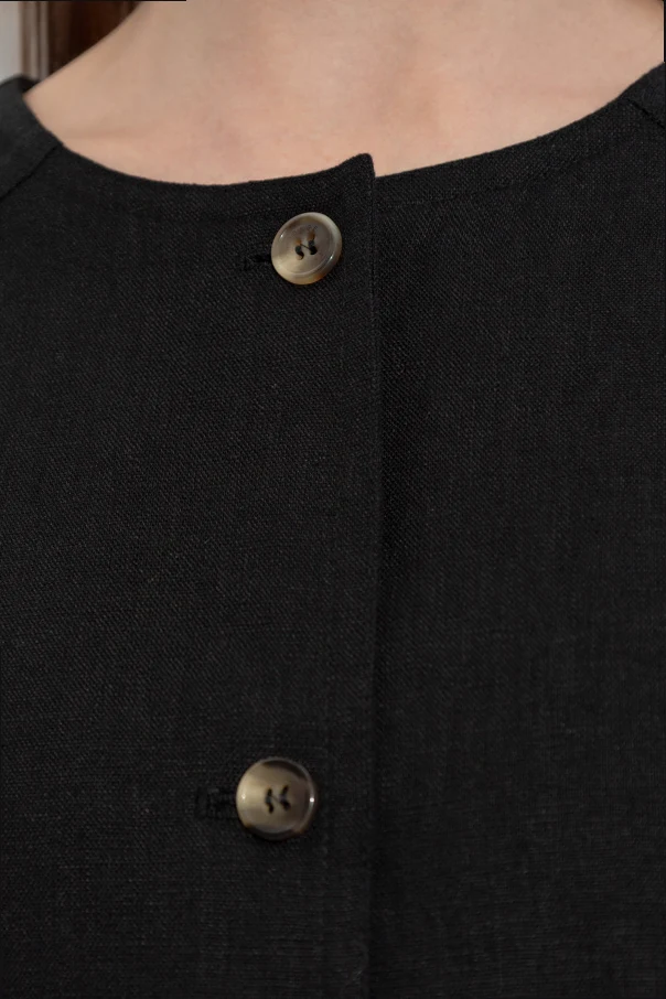 Wykonana w całości z naturalnego lnu, koszula jest przewiewna, a matowa, nieco grubsza struktura materiału zachowuje formę i elegancki wygląd. Gładką, czarną powierzchnię przełamują cztery wyraziste, kontrastowe guziki, które subtelnie przyciągają wzrok. Zamiast klasycznego kołnierza zastosowano zaokrąglony dekolt, podkreślający nowoczesną prostotę tej propozycji.