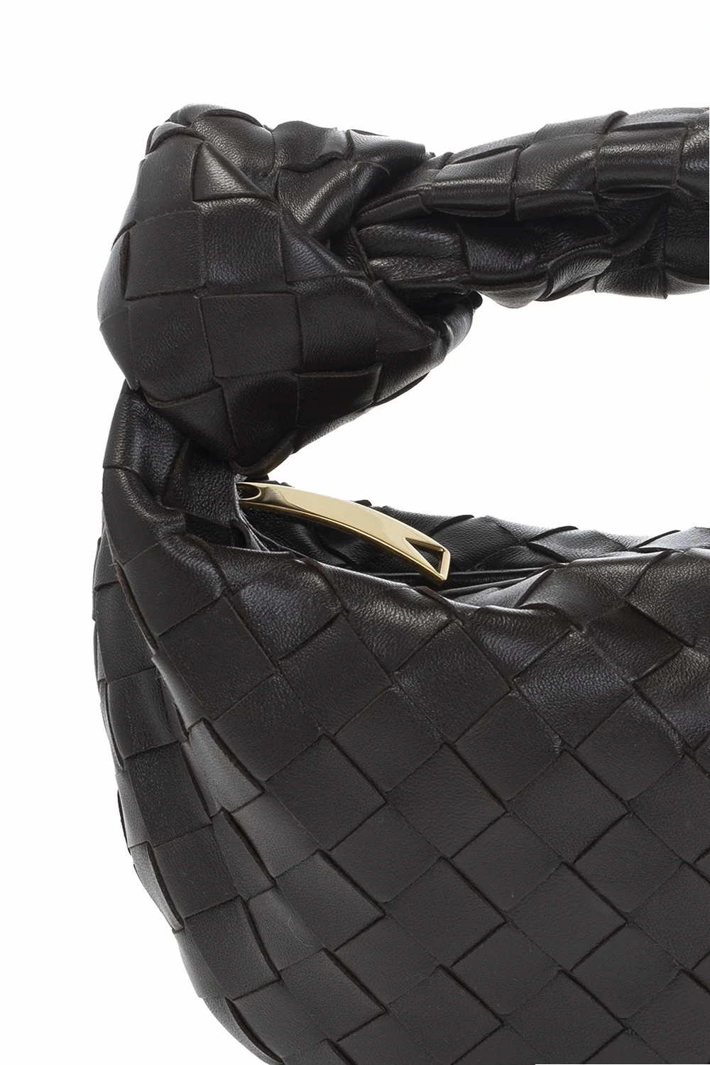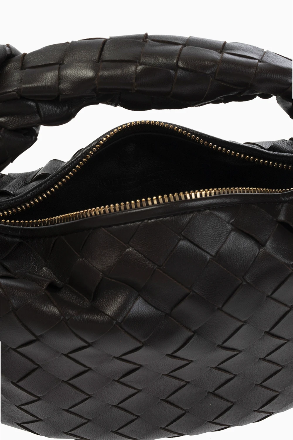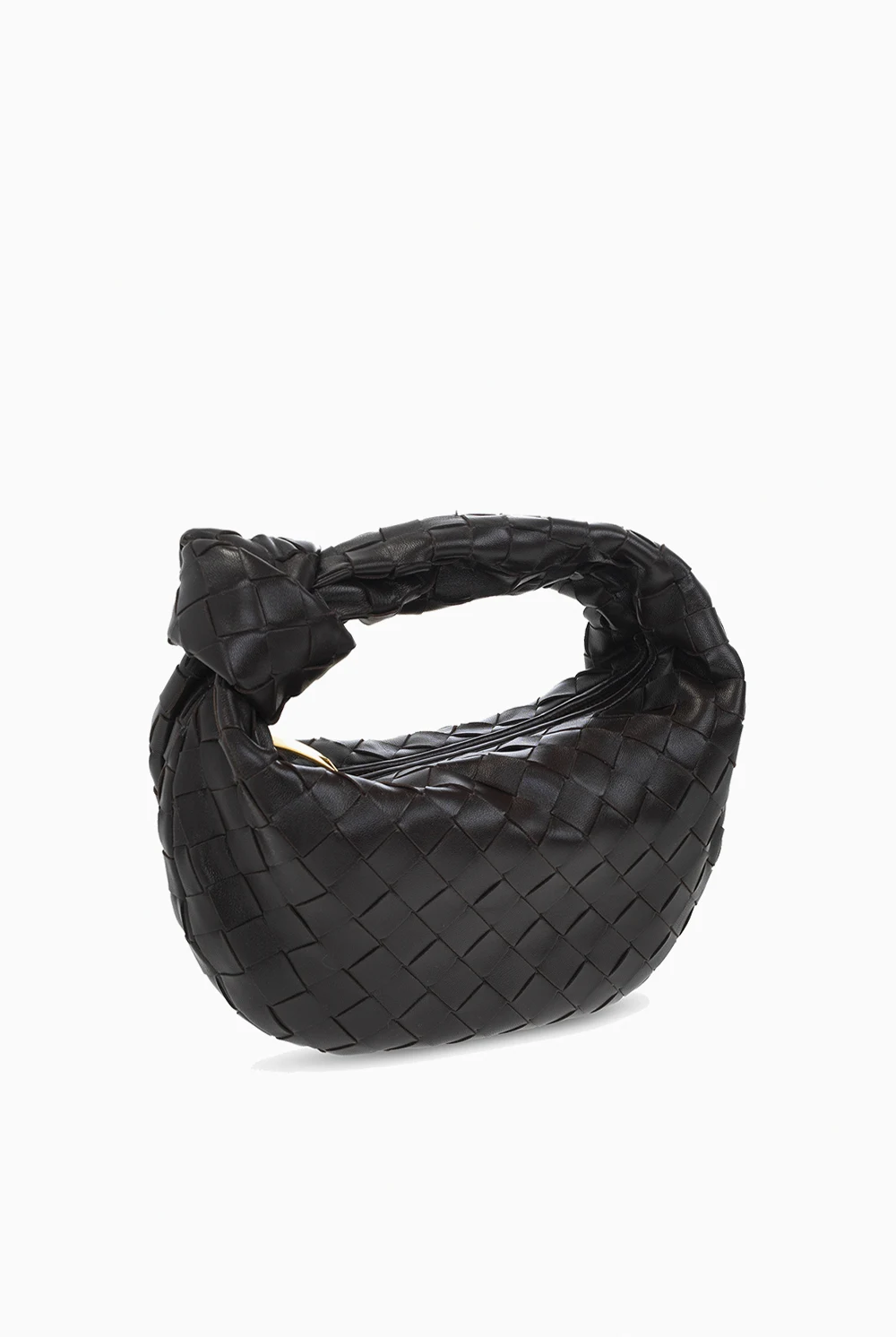 Ciemnobrązowa torba do ręki, model ‘Jodie Mini’ Bottega Veneta. Wykonana ze skóry jagnięcej oraz cielęcej. Zamykana na zamek. Ozdobiona charakterystyczną dla marki plecionką ‘Intrecciato’. Wewnątrz komora. Metalowe elementy w kolorze złotym.