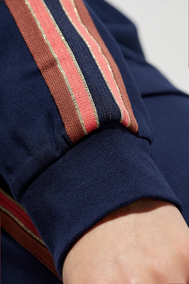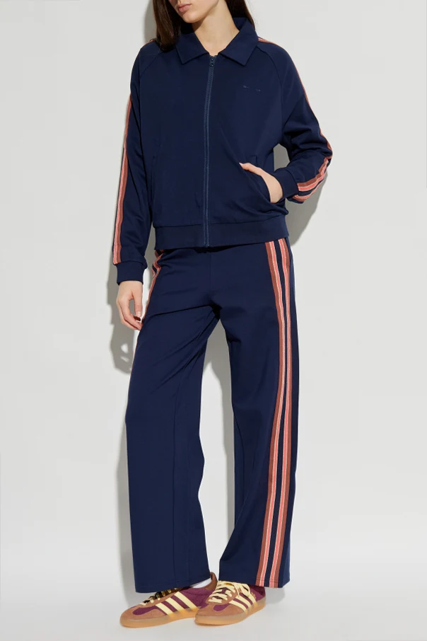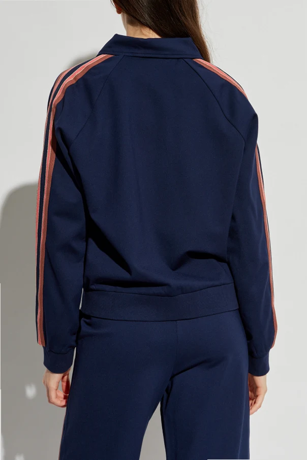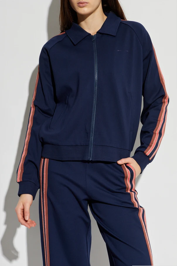 Kurtka z logo z ekskluzywnej kolekcji The Upside jest wyrazem subtelnej elegancji i wyrafinowanego stylu. Dominujący granatowy kolor stanowi fundament wyrazu estetycznego, wzbogaconego o kontrastowe lampasy na rękawach, w kolorach różowym, brązowym i ze złotą, metaliczną nicią. Całość utrzymana jest w casualowym, krótkim fasonie — zakończona na wysokości bioder, z klasycznym kołnierzykiem i zamkiem błyskawicznym.