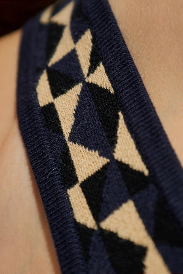 Szlachetną dzianinę w kolorze granatowym wyróżnia regularny, geometryczny wzór, na który składają się finezyjne motywy trójkątów i rombów, układające się w dekoracyjną mozaikę. Miękka, drapowana faktura materiału łączy w sobie wytrzymałość oraz elastyczność, a starannie wykonana naszywka z nazwą i logotypem projektanta, umieszczona przy karku, dopełnia całości ekskluzywnego wyrazu.
