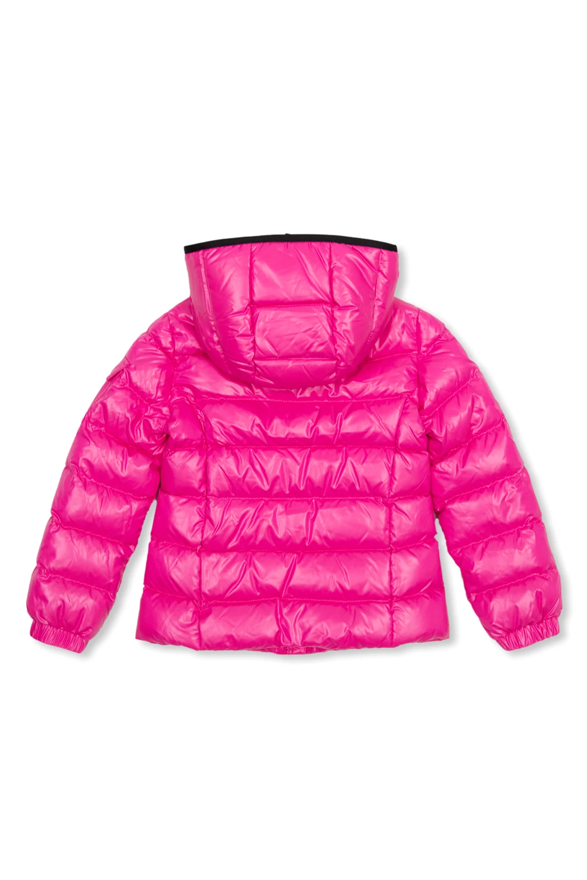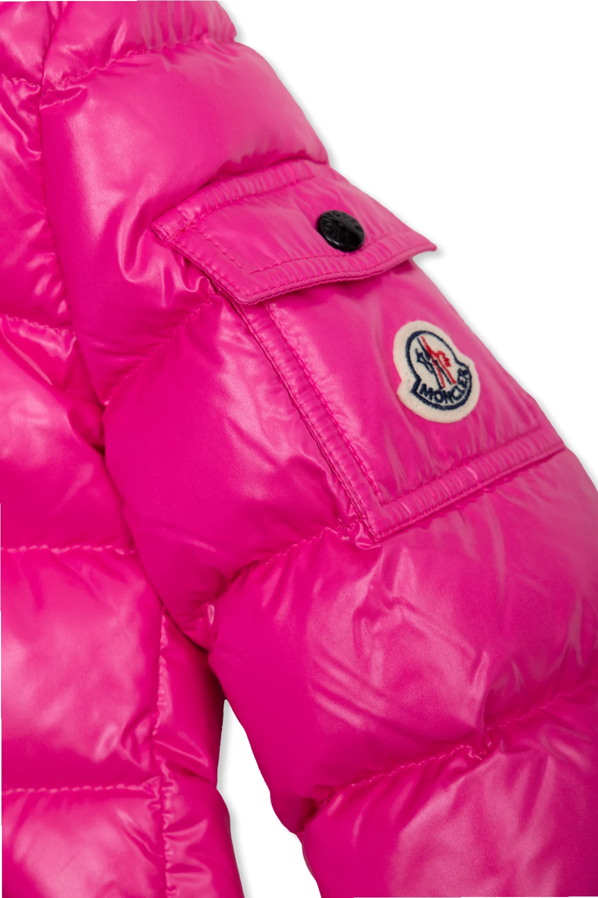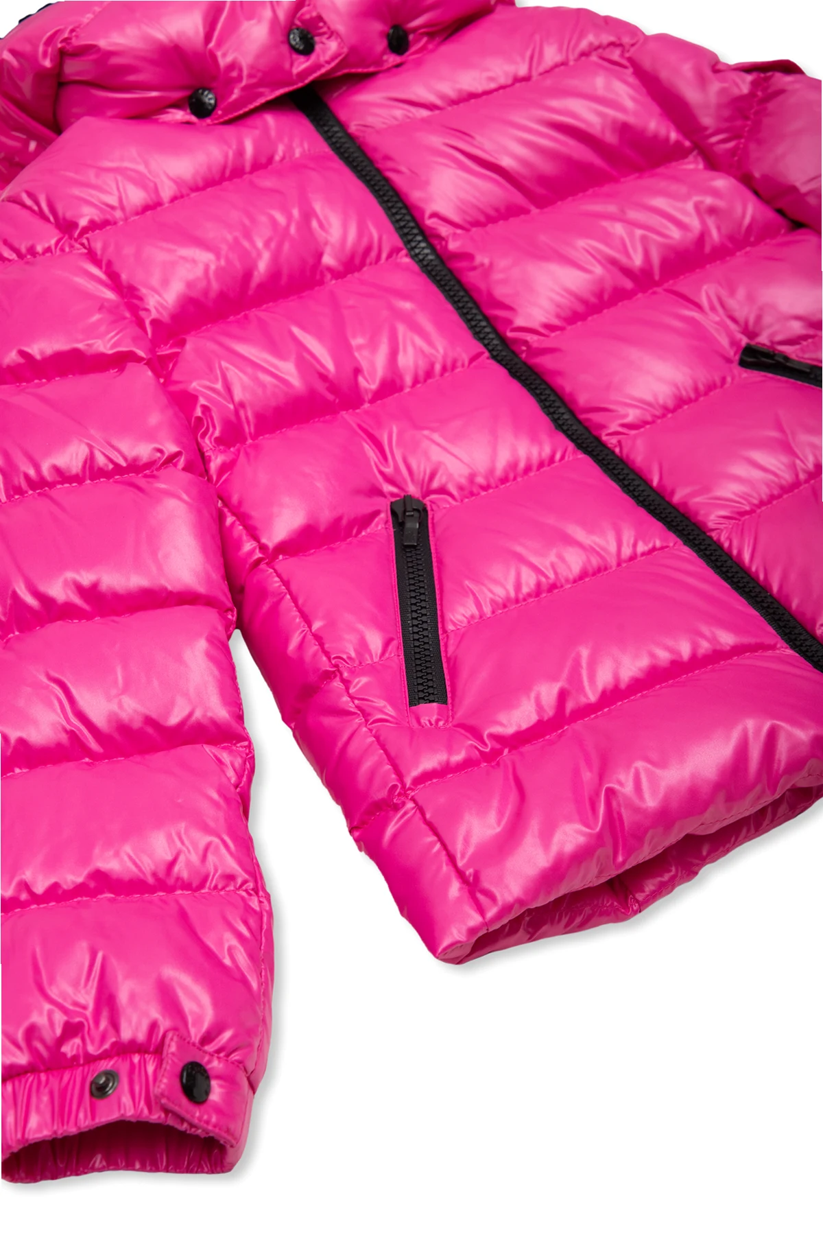 Różowa, pikowana kurtka puchowa, model ‘Bady’ Moncler Enfant. Odpinany kaptur. Przód i dwie kieszenie zapinane na zamek. Na rękawie kieszeń z patką zapinaną na zatrzask, ozdobiona naszywką z logo. Długie rękawy zakończone ściągaczem.