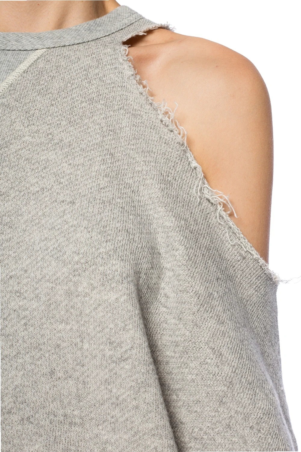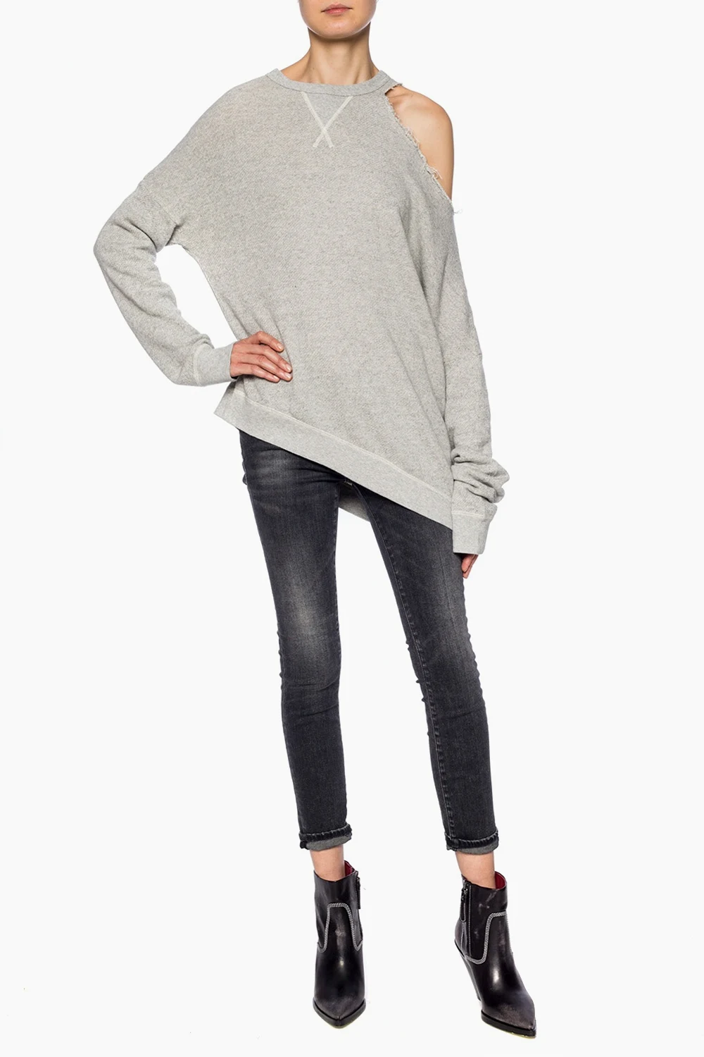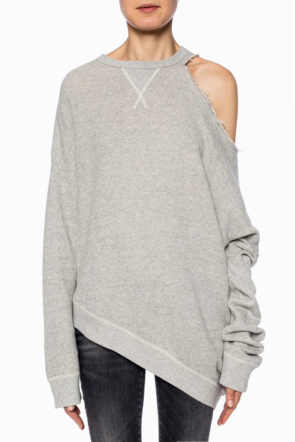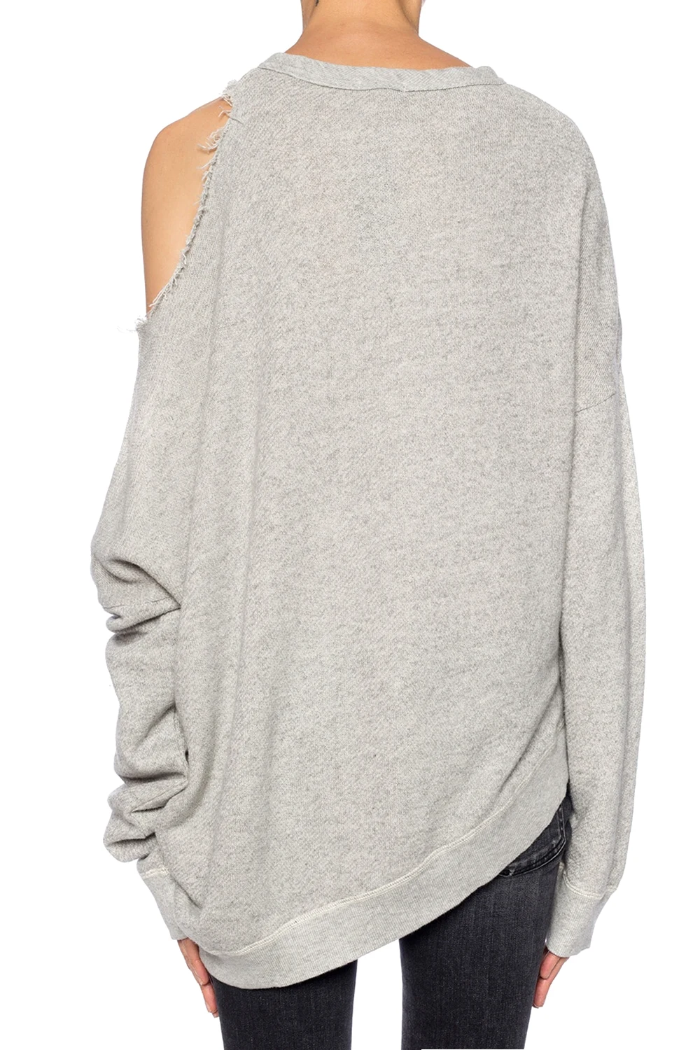 Szara, bawełniana bluza R13. Ozdobiona dziurą na ramieniu. Okrągły dekolt. Dół i rękawt zakończone ściągaczami.