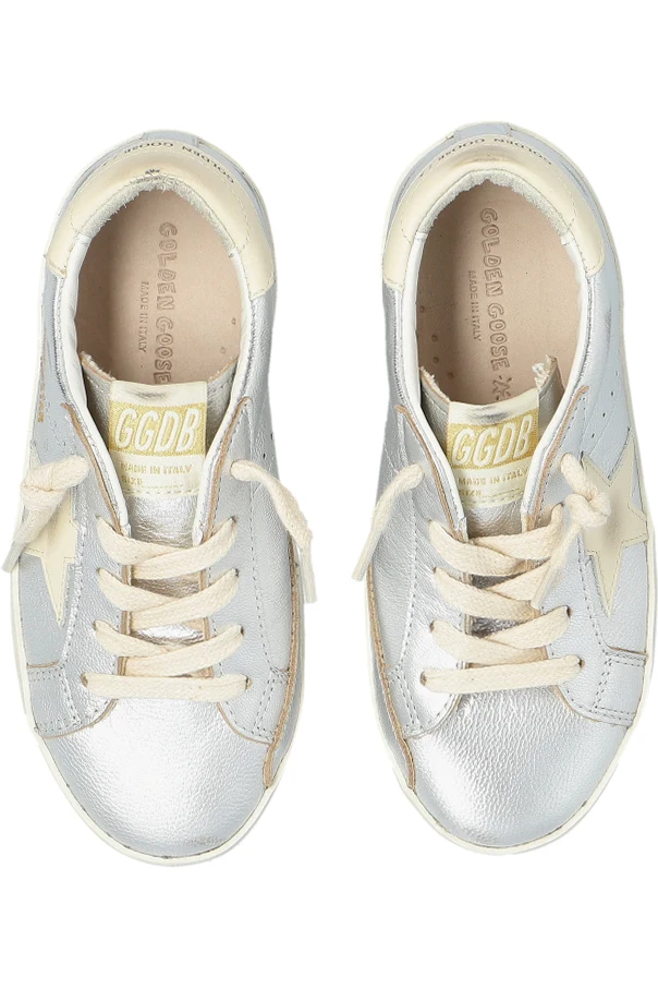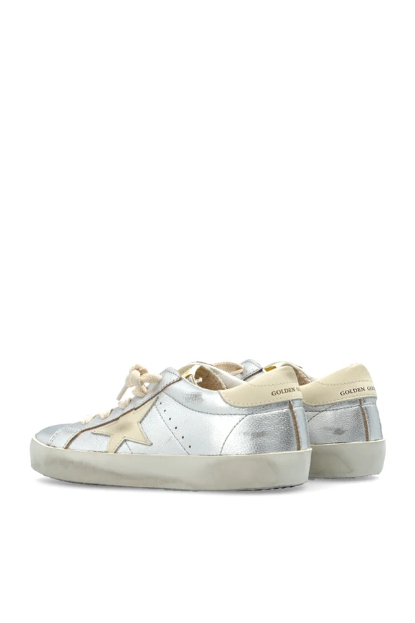 Wykonane z błyszczącej, metalicznej skóry, zachwycają srebrzystym odcieniem z kremowymi akcentami. Charakterystyczna gwiazda w kremowym kolorze oraz subtelne logo na pięcie i napis "Golden Goose" na boku dodają im niepowtarzalnego uroku. Podeszwa z efektem postarzenia oraz kremowe sznurówki podkreślają ich unikatowy charakter. Wewnątrz znajduje się nadruk "Golden Goose" oraz napis "GGDB" na języku, co jest ukłonem w stronę luksusowego dziedzictwa marki.