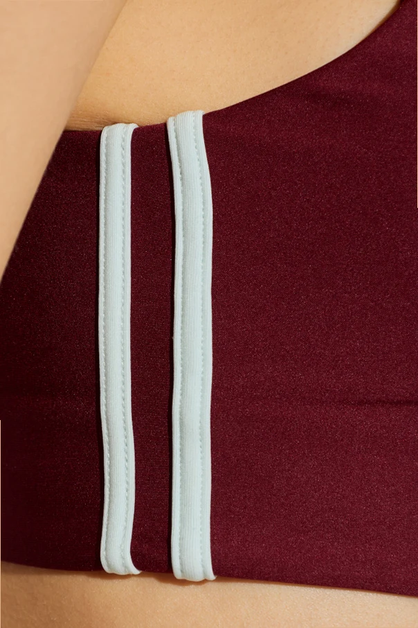 Wykonany z gładkiej, elastycznej dzianiny w szlachetnym kolorze bordo , biustonosz efektownie podkreśla sylwetkę, gwarantując przy tym doskonałe dopasowanie do ciała. Dwa pionowe, kontrastujące pasy w jasnym odcieniu po bokach stanowią subtelny detal ozdobny, który podkreśla unikatowość modelu. Całość zwieńcza minimalistyczny nadruk na plecach, oddający charakter marki.