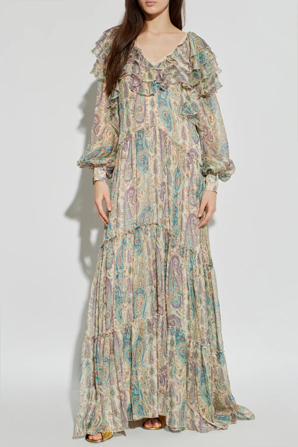 Swobodny, luźny fason z długimi rękawami zakończonymi mankietem zapewnia komfort i pełną swobodę ruchów, natomiast szerokie, wielowarstwowe falbany zdobiące dekolt oraz ramiona dodają całości romantycznego wdzięku. Sukienkę zdobi wielobarwny motyw paisley, będący hołdem dla orientalnego dziedzictwa – dominuje subtelny multikolor w pastelowych odcieniach turkusu, żółci, fioletu i zieleni.