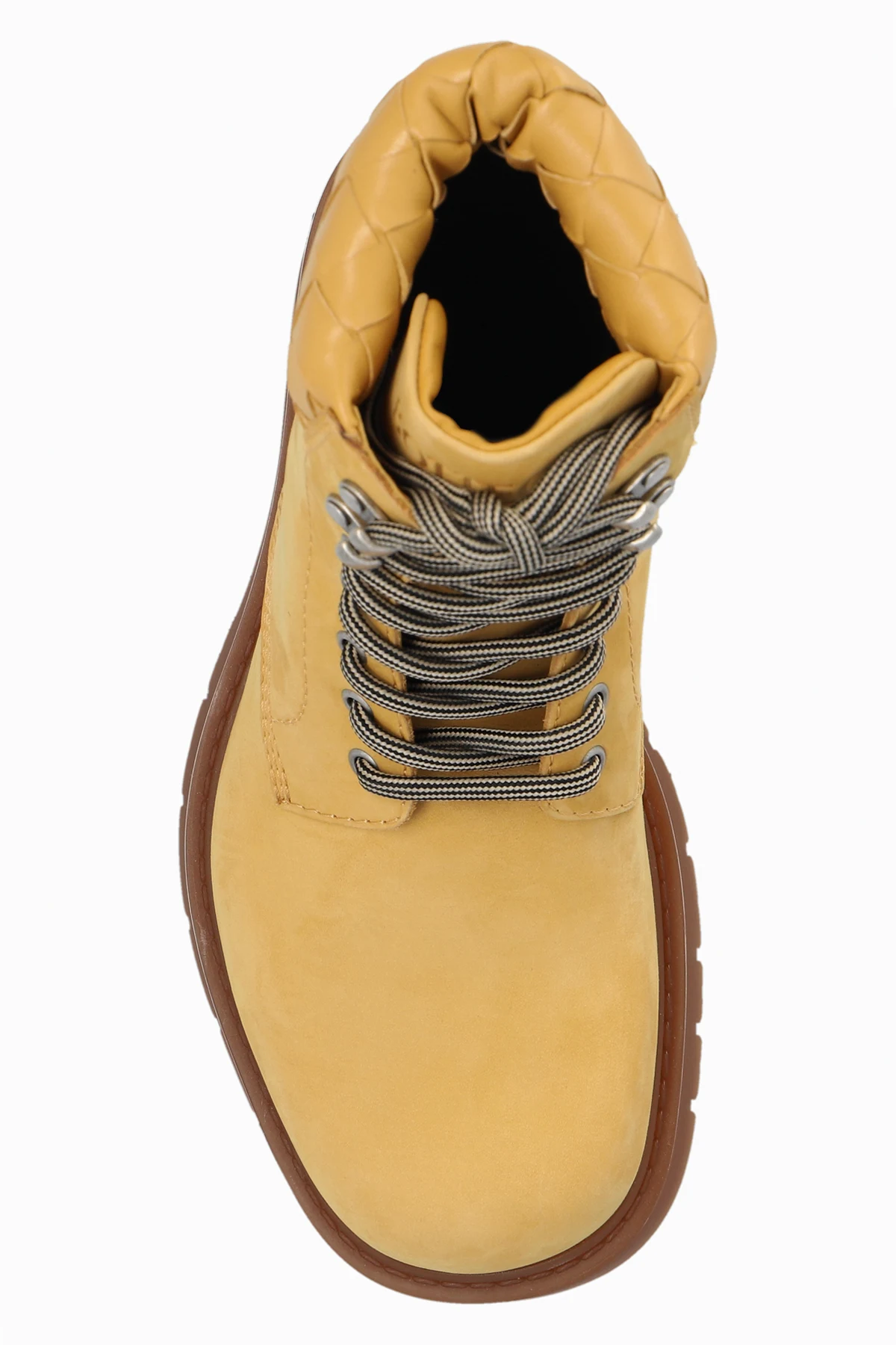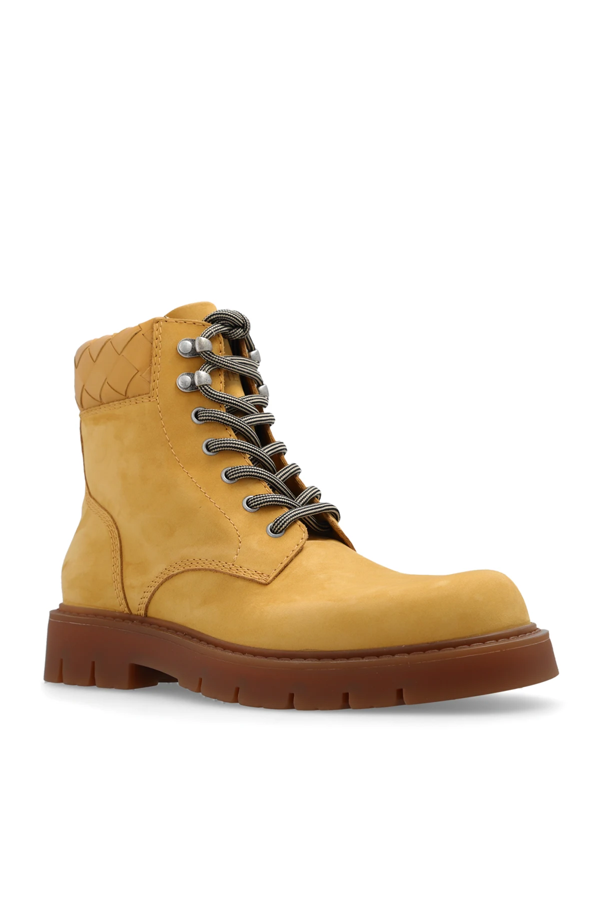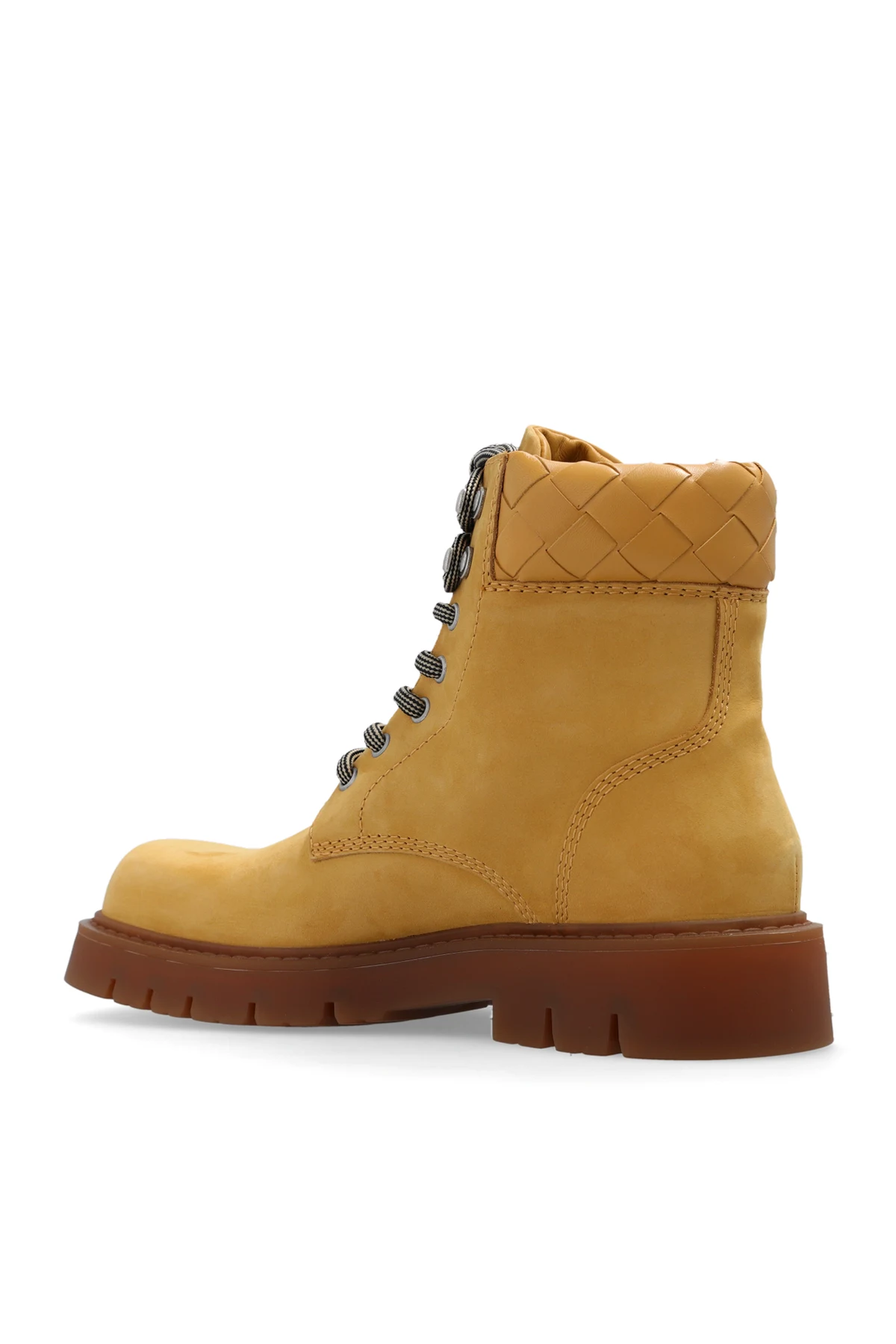 Beżowe, sznurowane botki Bottega Veneta. Wykonane z nubuku. Góra dekoracyjnie wykończona plecionką ‘Intrecciato’. Brązowa, gumowa podeszwa.