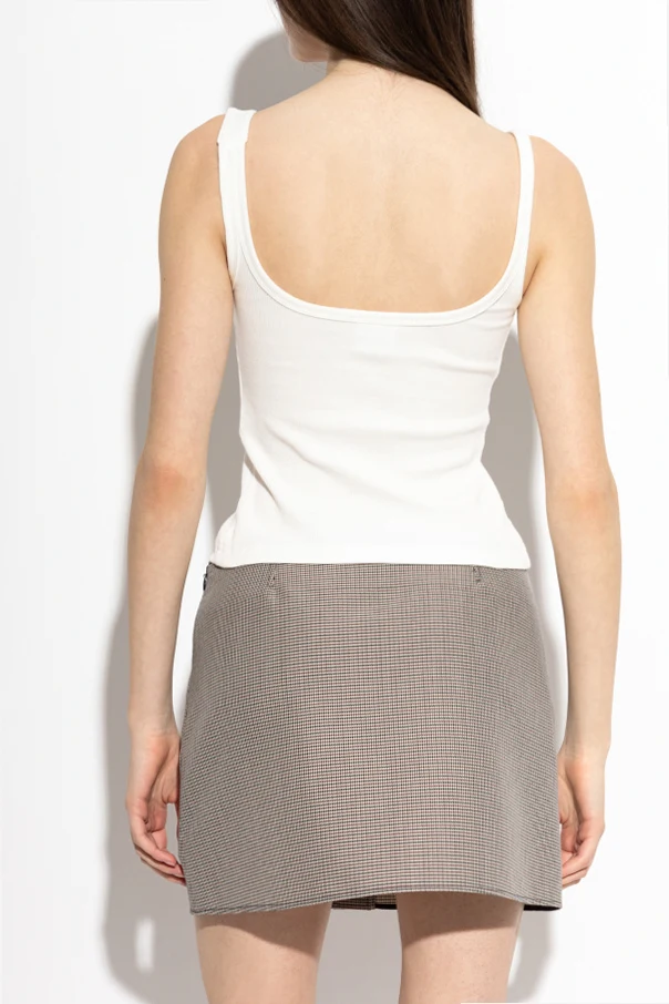 Prążkowany top bez rękawów marki Courrèges to esencja czystej formy i wyrafinowanej estetyki. Wykonany z elastycznej dzianiny o wyczuwalnej, subtelnej fakturze prążkowania, doskonale wpisuje się zarówno w codzienne stylizacje, jak i bardziej wyszukane zestawienia. Dopasowany, lekko taliowany krój podkreśla sylwetkę, a minimalistyczny, jednolity biały kolor emanuje nieprzemijającą elegancją.