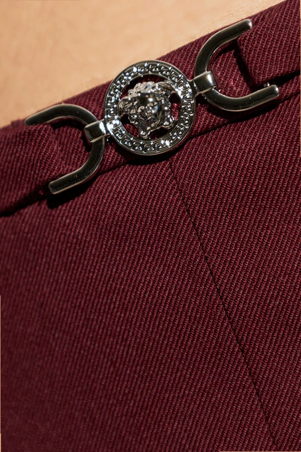 Gładka, jednolita tkanina w kolorze bordo emanuje klasą, podczas gdy głębokie, centralne rozcięcie z przodu dodaje całości nowoczesnego wyrazu. W pasie uwagę przykuwa elegancka metalowa aplikacja, podkreślająca ekskluzywny charakter projektu i wpisująca się w bogatą tradycję marki Versace.