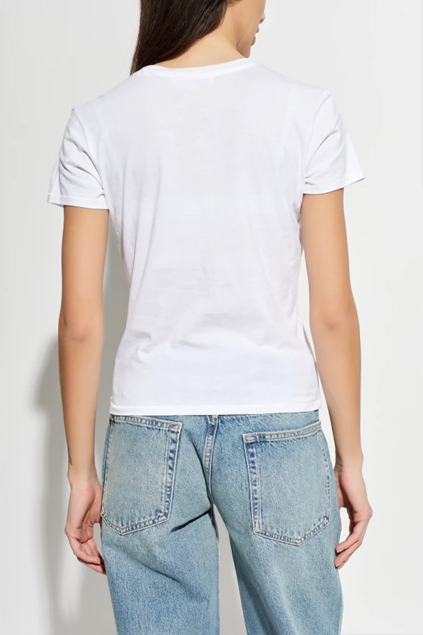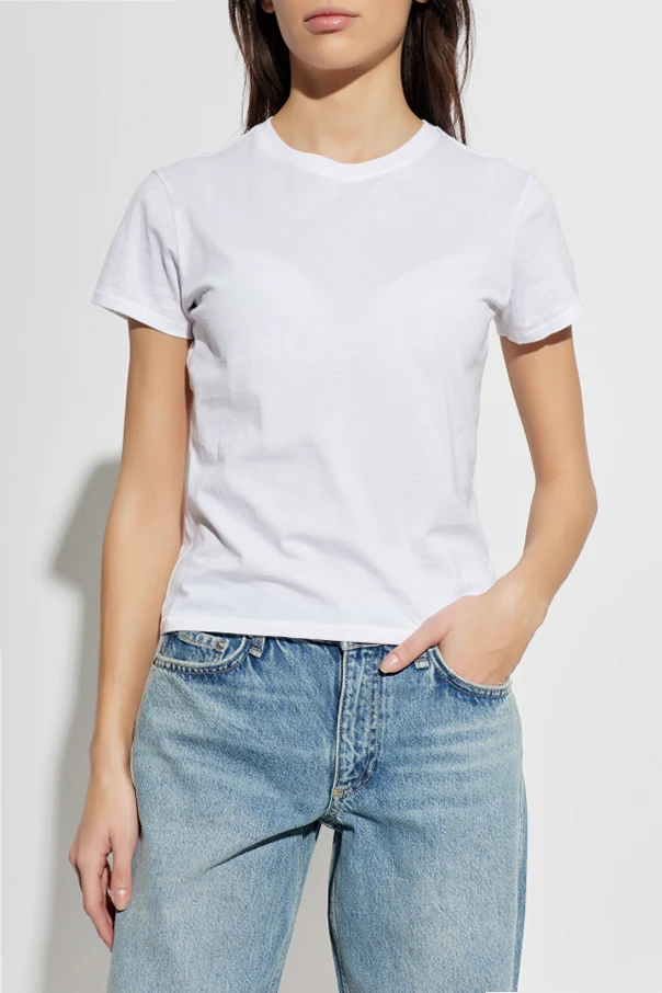 Bawełniany T-shirt od FRAME jest kwintesencją minimalistycznej elegancji, dedykowaną koneserom ponadczasowego stylu. Starannie zaprojektowany, klasyczny fason o lekko dopasowanej sylwetce układa się harmonijnie na ciele, podkreślając subtelność kroju. Krótki rękaw oraz okrągły dekolt tworzą wyrafinowaną całość, która zachwyca ascetyczną formą.