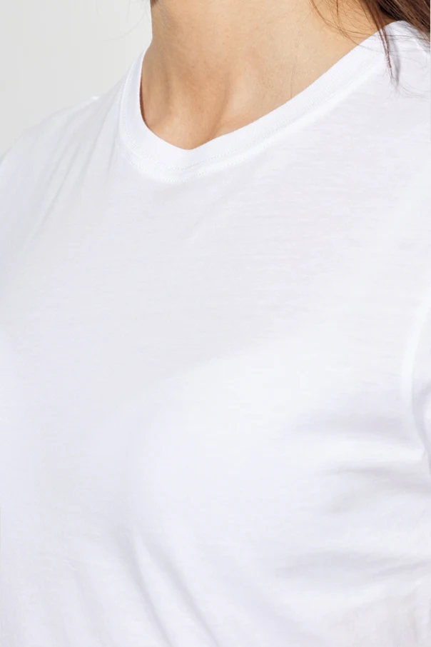 Produkt wykonano z delikatnej, lekkiej tkaniny bawełnianej w białym odcieniu, której naturalna faktura zdradza najwyższej jakości włókno. Gładka powierzchnia pozbawiona jest wzorów, nadruków oraz jakichkolwiek zdobień, co uwydatnia uniwersalność i ekskluzywność T-shirtu.