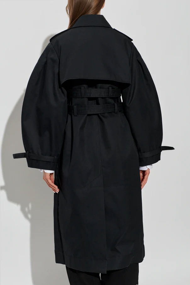 Wyraziste ramiona z epoletem oraz szerokie, balonowe rękawy harmonijnie komponują się z dwoma szerokimi paskami, ozdobionymi metalowymi oczkami i srebrnymi klamrami, które mocno podkreślają talię i wprowadzają industrialną nutę. Staranność wykonania oraz subtelność detali dopełniają aurę wyrafinowania, sprawiając, iż trencz ten jest unikatem w świecie mody.