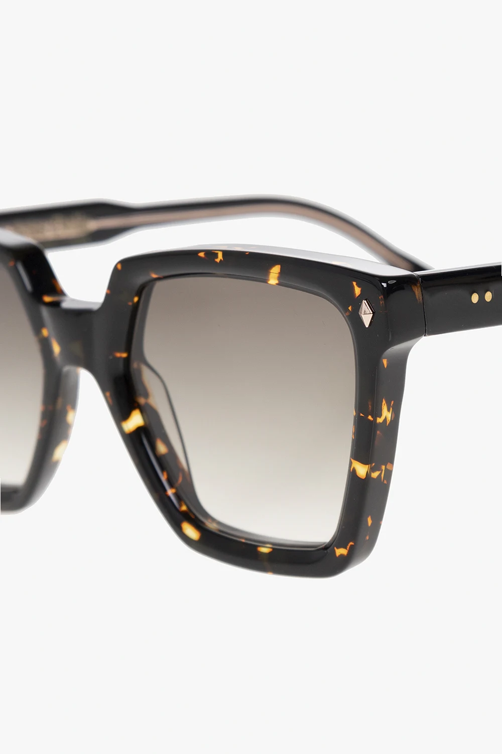 Czarno-żółte okulary przeciwsłoneczne, model ‘Margot’ John Dalia. Oprawki w kształcie skrzydeł motyla wykonane z szylkretowej, 8-milimetrowej płyty octanowej. Aplikacje na przodzie i zauszniki wykonane z żółtego złota. Gradientowe soczewki w kolorze zielonym ze 100% ochroną przed promieniami UVA/UVB. Dołączone etui.