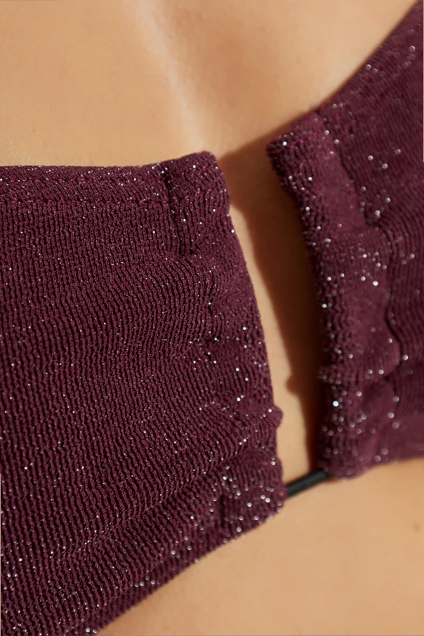 Góra od kostiumu kąpielowego Blake marki Bond-Eye to kwintesencja współczesnej elegancji, wyrażona przez ponadczasowy model bandeau. Piękny, głęboki kolor bordo , pozbawiony zbędnych ozdób, podkreśla wyrafinowany minimalizm tej propozycji. Delikatnie połyskująca dzianina z wyraźną strukturą odbija światło, tworząc subtelny blask, zaś centralne rozcięcie z ozdobnym paskiem dodaje całości oryginalnego charakteru.