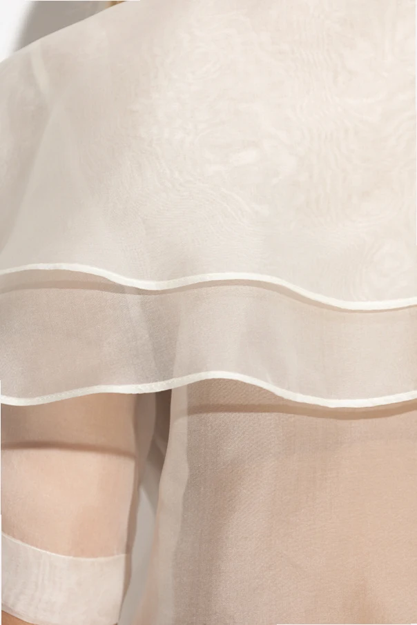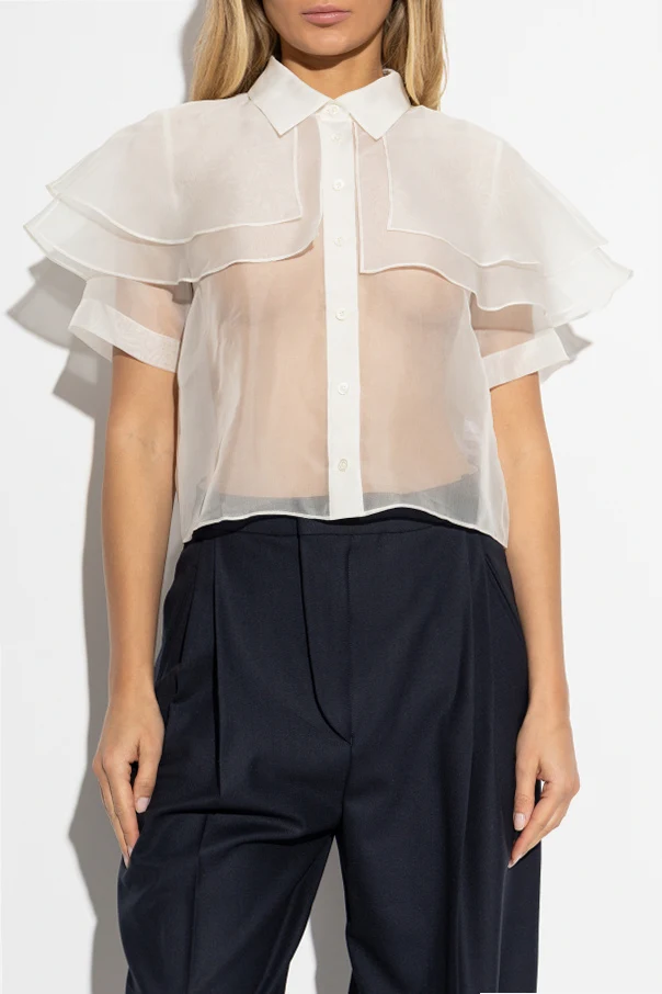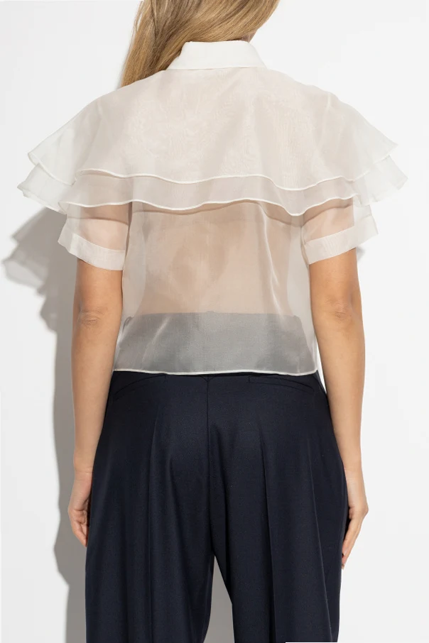 Jedwabny top z falbanami to wytworna propozycja marki FRAME, tworzona dla koneserek subtelnej elegancji. Uszyty z kremowego jedwabiu o przezroczystej strukturze, top ujmuje lekkością i imponuje zwiewnością.