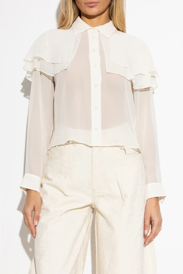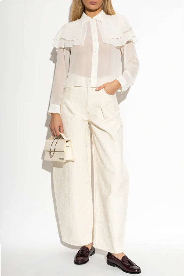 Koszula z falbanami projektu FRAME to kwintesencja finezji oraz nowoczesnej elegancji. Oferuje uniwersalny, lekko pudełkowy krój, który delikatnie oplata sylwetkę, pozostając subtelnie krótkim tuż nad linią bioder. O wyjątkowości modelu świadczą szerokie falbany efektownie biegnące od linii ramion, otulając górną partię pleców i klatki piersiowej, co nadaje całości niepowtarzalny, artystyczny charakter.