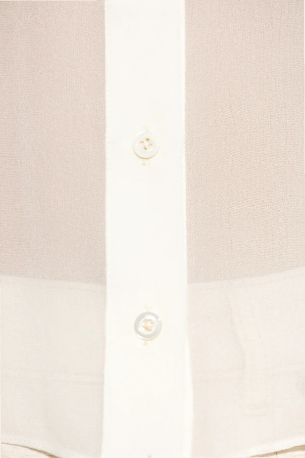 Kreacja została uszyta ze szlachetnego, lekkiego jedwabiu o półprzezroczystej strukturze, gwarantując niezwykłe doznania podczas noszenia. Całość dopełniają klasyczny, sztywny kołnierzyk oraz smukłe kremowe guziki, zaś długie rękawy zakończono prostymi mankietami.