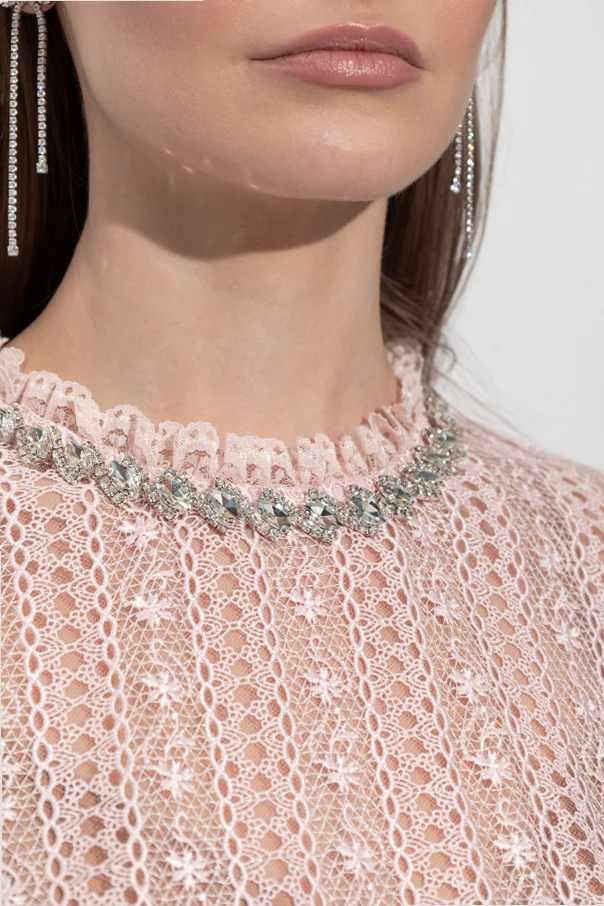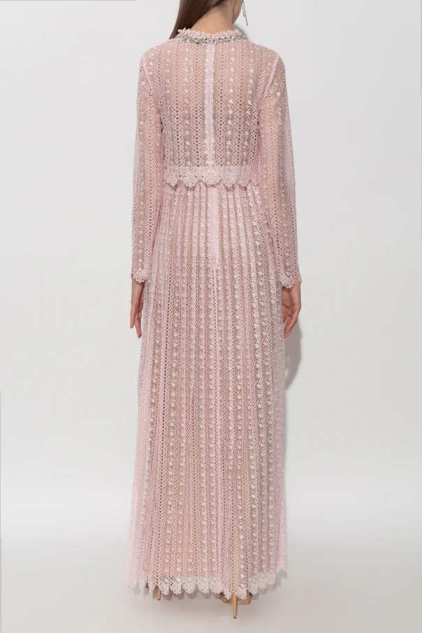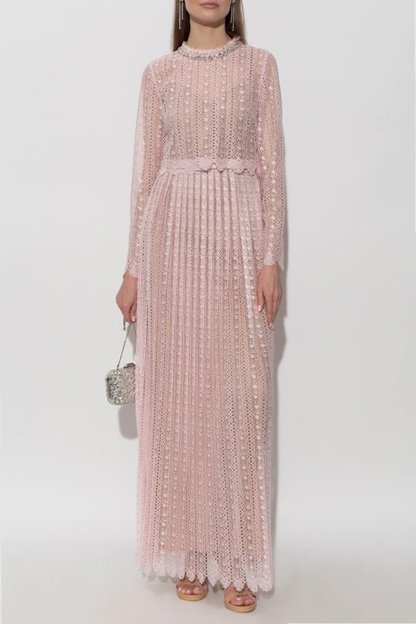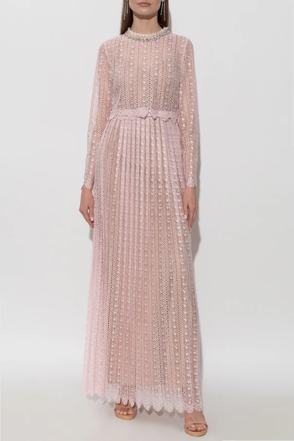 Koronkowa sukienka z paskiem od Self-Portrait to uosobienie ponadczasowej elegancji i wyszukanego smaku. Długa, klasycznie rozkloszowana forma z delikatnie falbanową stójką oraz długimi, prostymi rękawami subtelnie podkreśla sylwetkę. Całość wykonana jest z ażurowej, florystycznej koronki w różowym odcieniu, której regularny motyw oraz ozdobne plisy wydłużają linię ciała, zapewniając lekkość i dostojność ruchów.