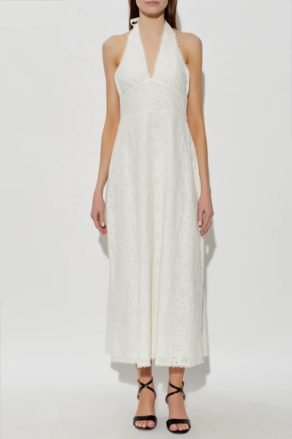 Sukienka zachwyca wydłużonym, lekko rozkloszowanym fasonem, sięgającym powyżej kostek, oraz subtelną linią podkreśloną w talii delikatnym marszczeniem. Elegancka góra na szerokich ramiączkach z wiązaniem na szyi typu halter eksponuje ramiona i plecy, zaś dekolt w szpic harmonijnie wydłuża sylwetkę.
