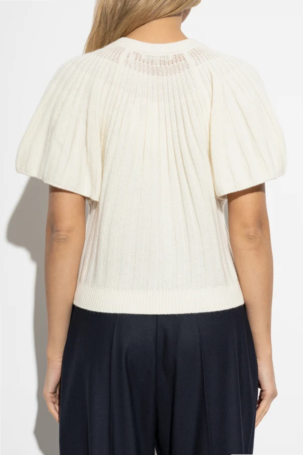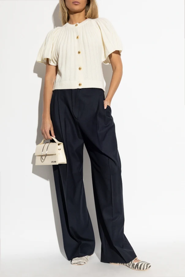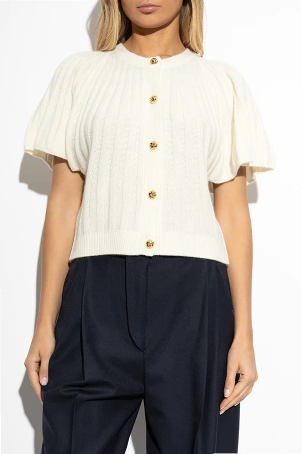 Kardigan bez rękawów to synonim subtelnej elegancji inspirowanej luksusową prostotą. Model wyróżnia się krótkim, lekko pudełkowym fasonem sięgającym do pasa, podkreślonym przez efektowne, bufiasto marszczone rękawy oraz okrągły dekolt wykończony prążkowaną lamówką.