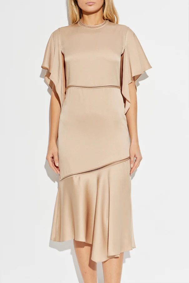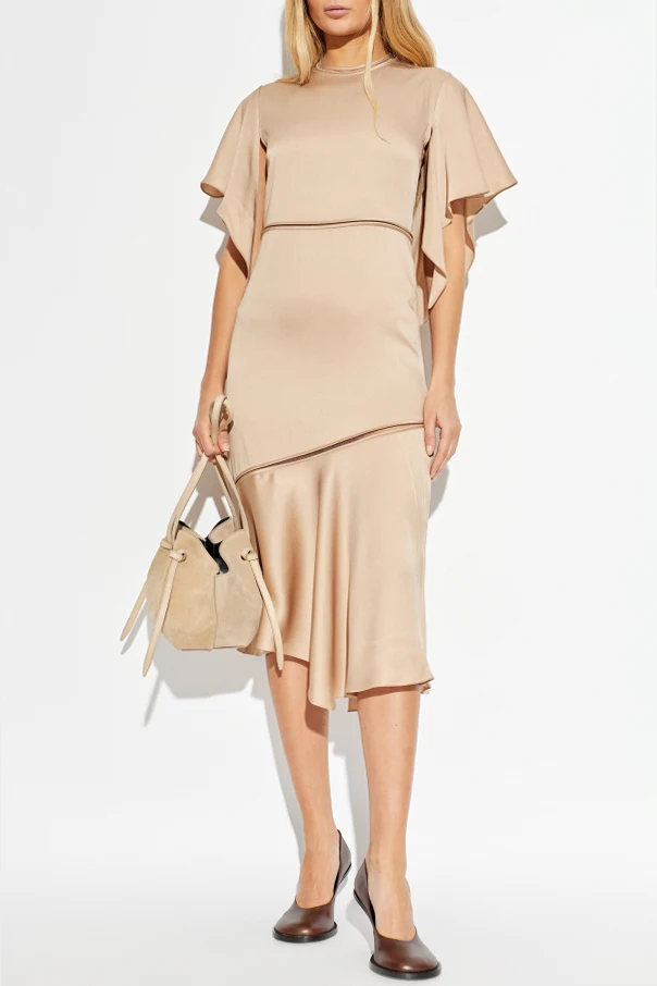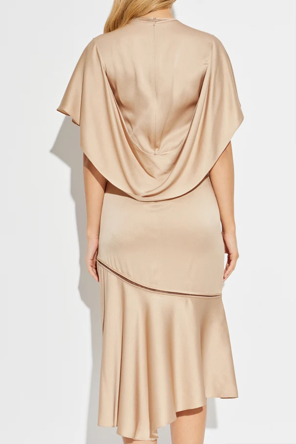 Satynowa sukienka o asymetrycznym kroju marki Fabiana Filippi stanowi esencję wyrafinowanej elegancji w odcieniu beżowym. Uwagę zwraca jej intrygujący fason – prosty w części centralnej, finezyjnie zwężany w talii, z asymetrycznym cięciem oraz misternym marszczeniem, które nadają sylwetce lekkości i dynamiki. Tył sukienki urozmaicono kaskadowym efektem opadającego materiału, harmonijnie współgrającym z rozkloszowanymi, motylkowymi rękawami.