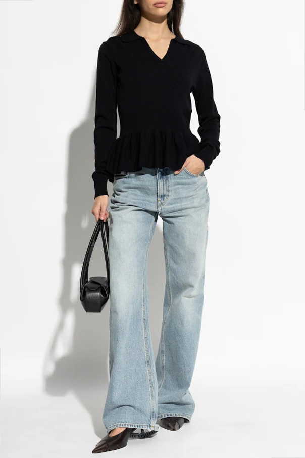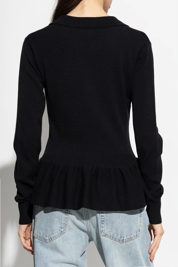 Sweter z baskinką marki ROTATE to esencja wysublimowanego stylu i kobiecego wyrafinowania. Klasyczny krój z długim rękawem subtelnie podkreśla sylwetkę, a efektowna, rozkloszowana baskinka nadaje mu lekkość oraz elegancję. Dekolt w kształcie litery V z filigranowym kołnierzykiem stanowi pełen wdzięku akcent, harmonizując z całością projektu.