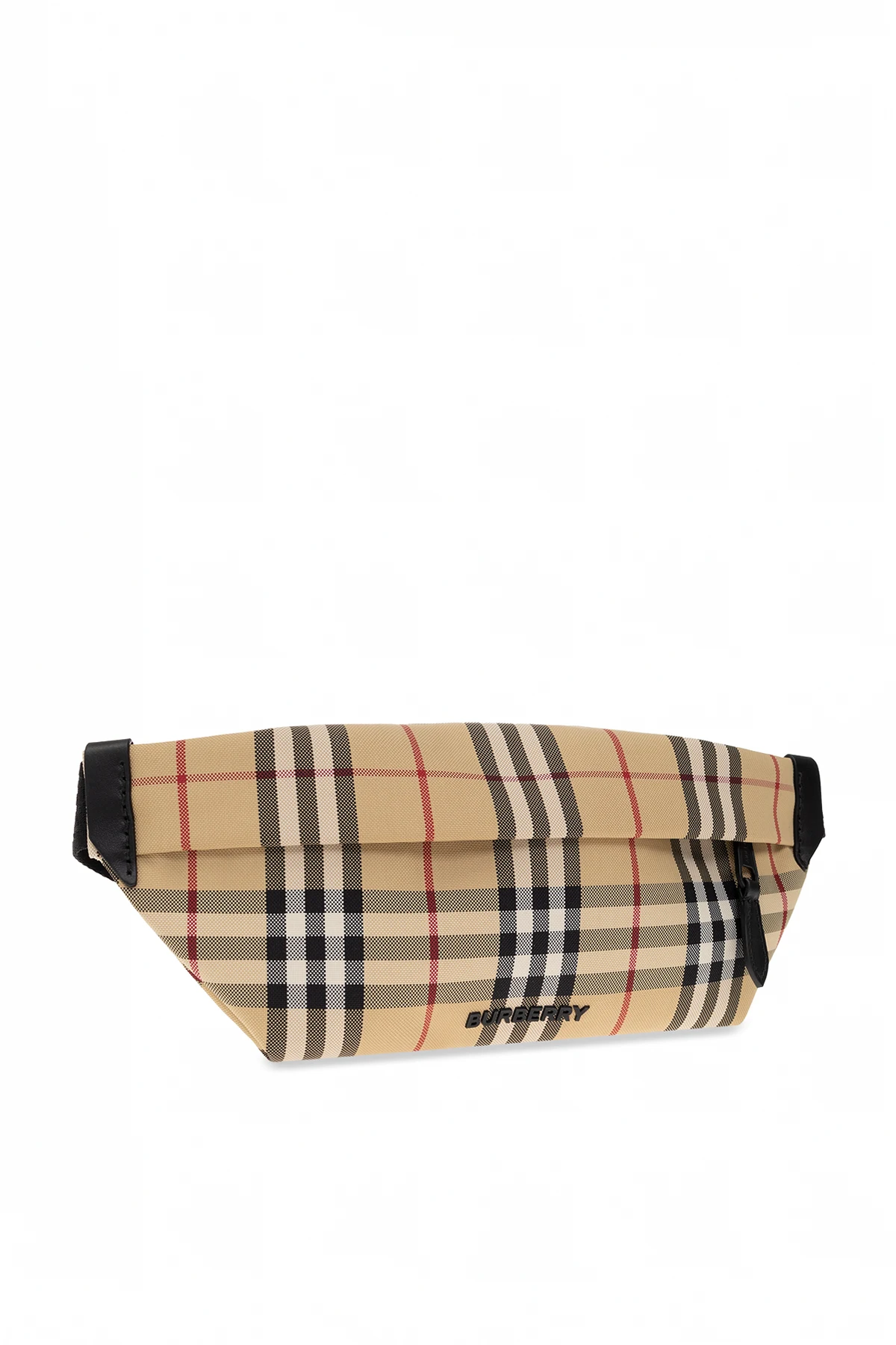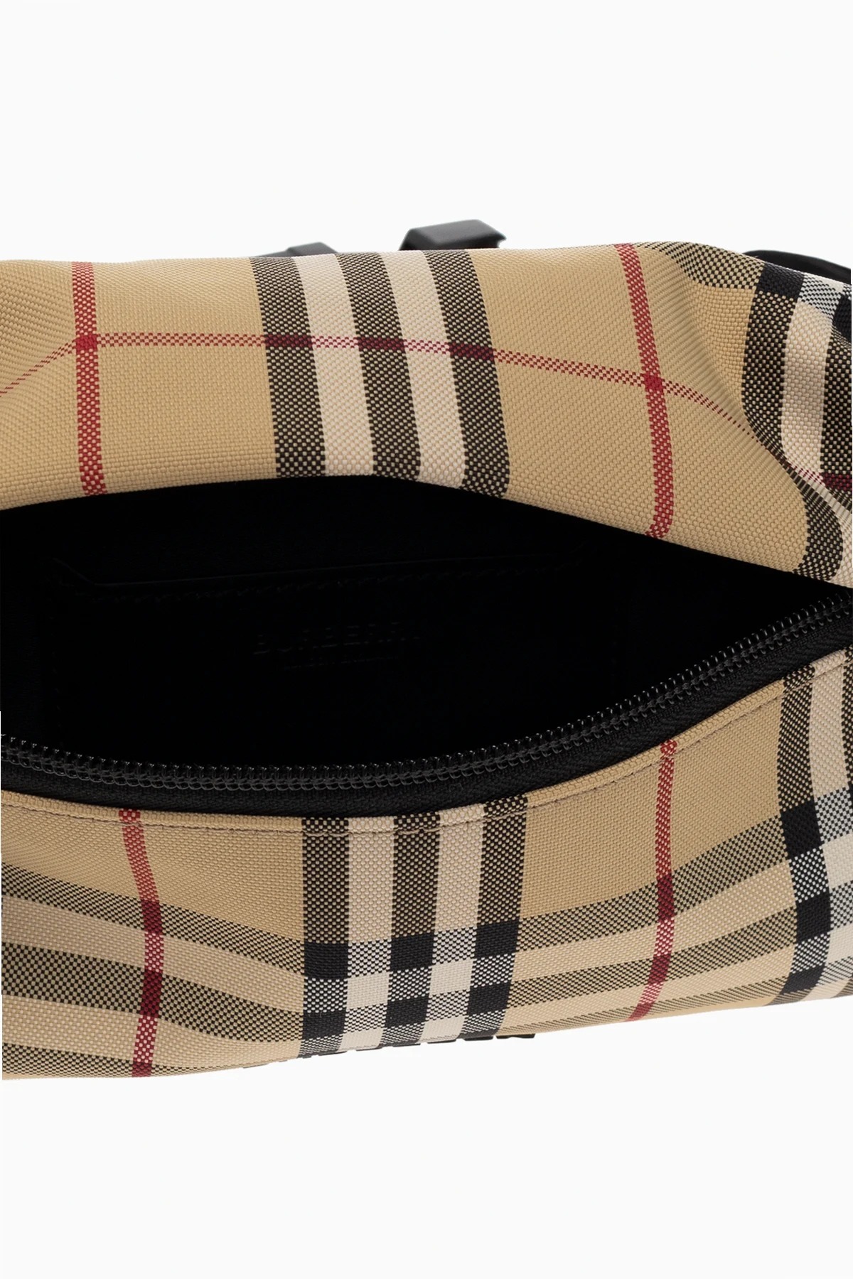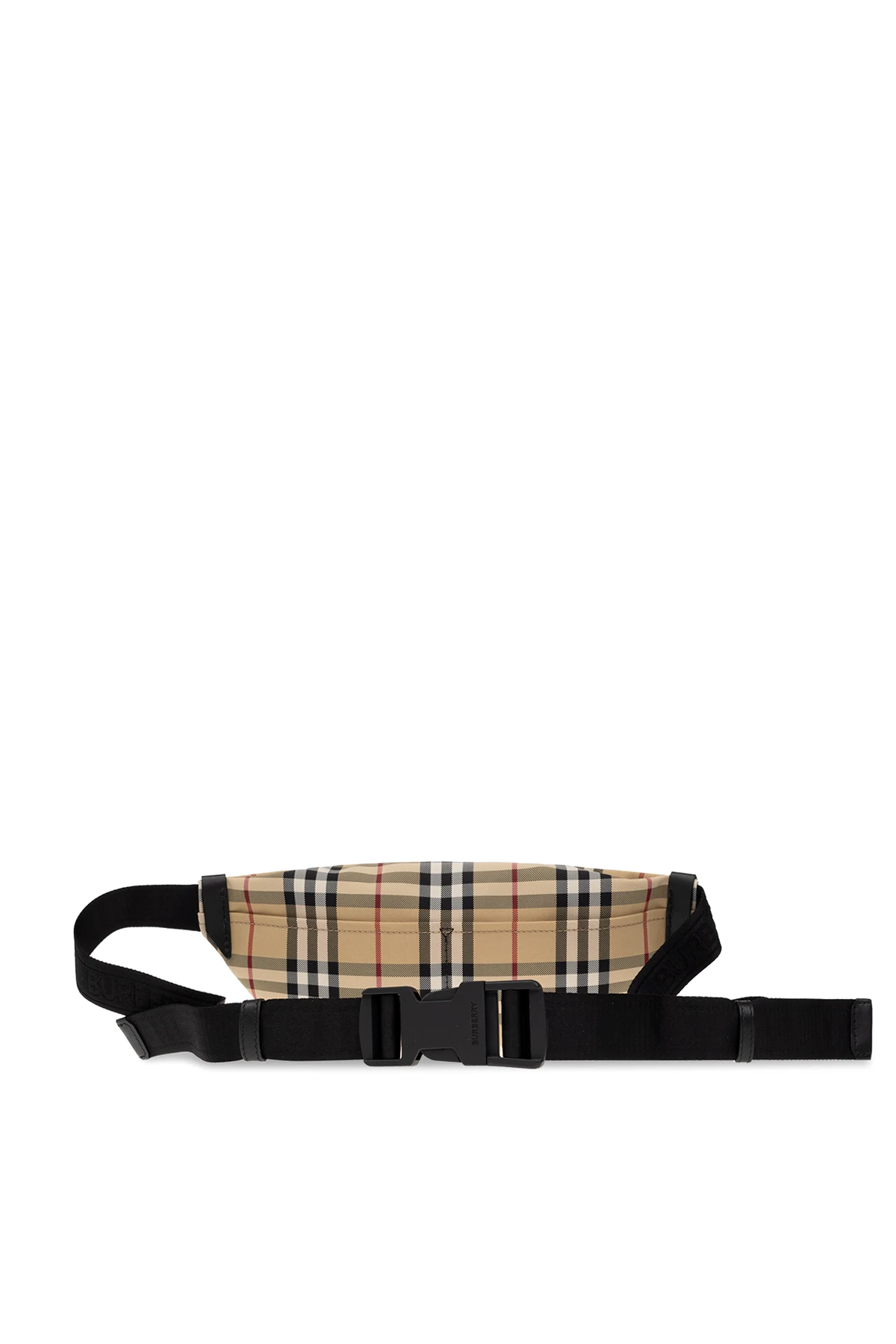 Beżowa torba na pas, model ‘Stevie’ Burberry. Wykonana z materiału ozdobionego kolorową, charakterystyczną dla marki kratą. Wykończona skórą cielęcą w kolorze czarnym. Zamykana na zamek. Z przodu gumowa aplikacja w kształcie logo. Z tyłu dwie wsuwane kieszenie. Regulowany pas z zapięciem na klamrę. Wewnątrz komora z miejscem na kartę i brelokiem na pasku.