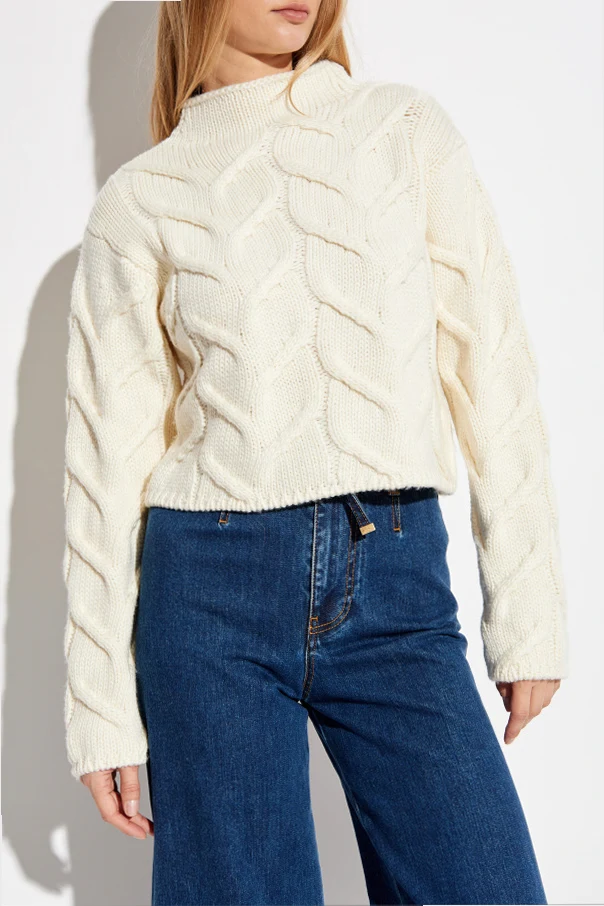 Całość charakteryzuje efektowny, szeroki wzór warkoczowy, biegnący przez korpus oraz długie rękawy, co sprawia, że sweter urzeka swoją designerską wyjątkowością. Dzianina z najwyższej jakości wełny gwarantuje miękkość i ciepło, a starannie wykończone mankiety oraz dół podkreślają precyzję wykonania. Brak widocznych logotypów potęguje jego ponadczasowy, luksusowy wydźwięk.