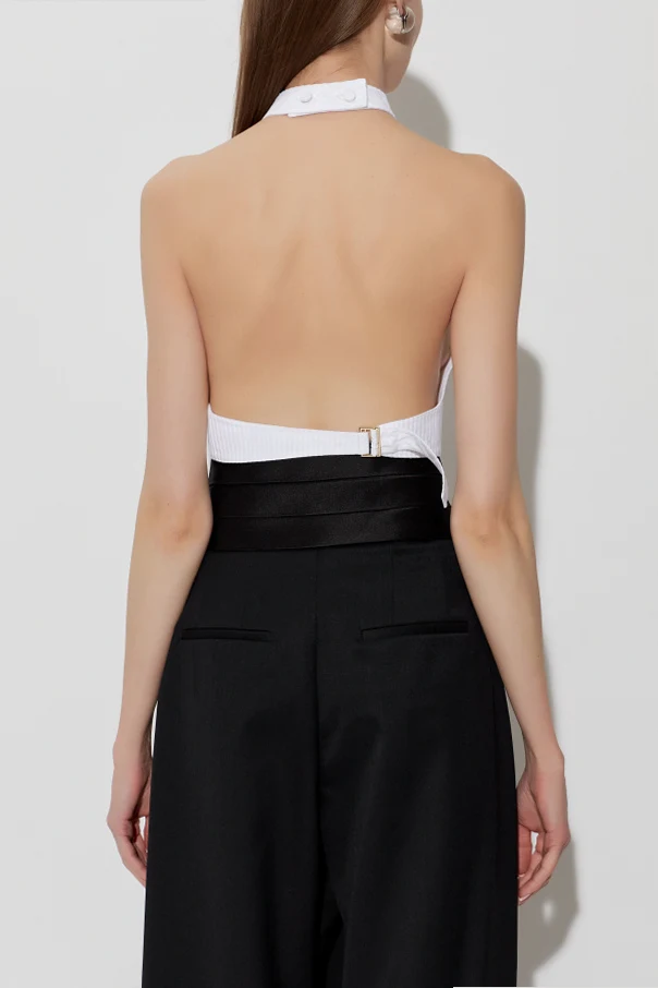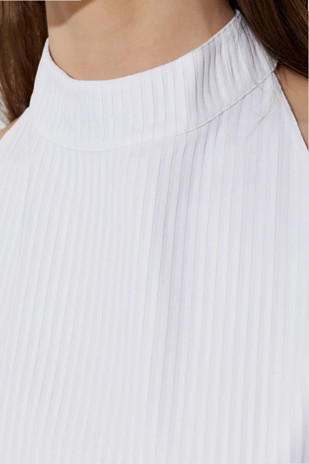 Plisowany top bez rękawów marki Alaïa to wyrafinowana propozycja dla koneserek subtelnej elegancji. Krótki, dopasowany fason z wysoką stójką harmonijnie podkreśla sylwetkę, a odkryte ramiona oraz szeroko wycięte boki z całkowicie odsłoniętymi plecami kreują efekt niebanalnej lekkości.