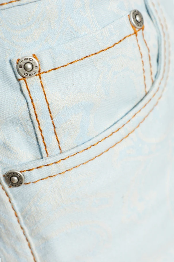 Jasnoniebieski odcień materiału, subtelnie wzbogacony szlachetnym, wplecionym ornamentem nawiązującym do motywów roślinnych, przywołuje artystyczną tradycję marki. Klasyczny fason z pięcioma kieszeniami i kontrastowe, brązowe przeszycia tworzą niepowtarzalny, dopracowany detal.