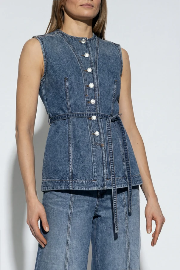 Jeansowa kamizelka Dominio marki Sportmax to kwintesencja elegancji i nowoczesności w szlachetnym wydaniu. Uszyta z doskonałej jakości niebieskiego denimu o subtelnym spraniu, subtelnie podkreśla sylwetkę lekko taliowanym fasonem oraz precyzyjnym wykończeniem. Harmonijny, zaokrąglony dekolt typu "crew neck" oraz duże, metalowe guziki z przodu nadają całości nutę wyrafinowanej swobody i modowego wyrazu.