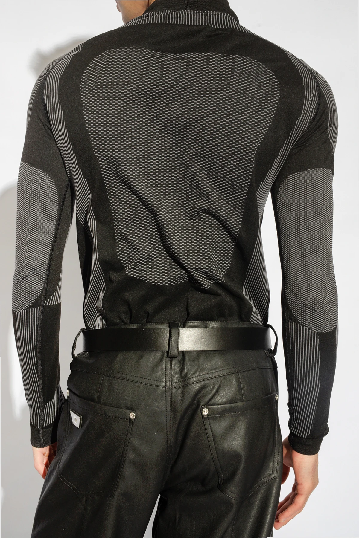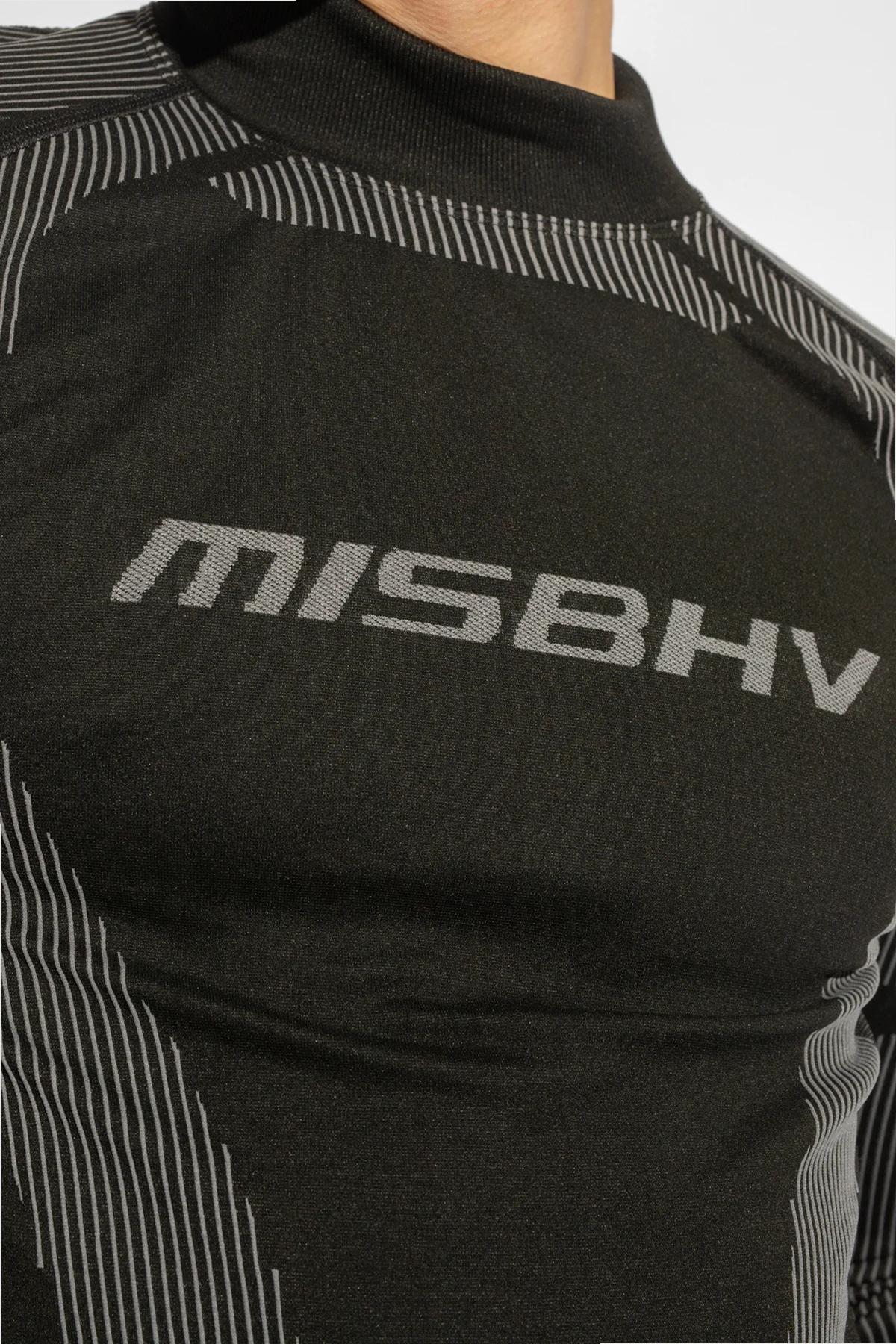 Czarno-biały top, model 'Sport Active Classic' MISBHV. Wykonany z oddychającego materiału termoaktywnego o sylwetce przylegającej do ciała. 55% przędzy pochodzi z recyklingu. Ten fason ma stójkę, długie rękawy, elastyczne wykończenia u dołu i na mankietach, odsłonięte przeszycia i wyszywane logo.