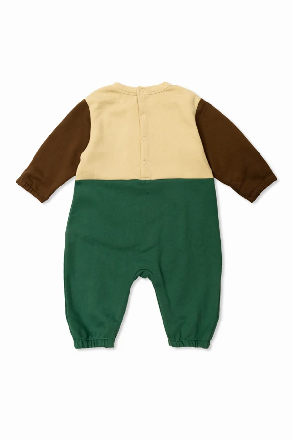 Dwukolorowa kompozycja – harmonijne połączenie beżowych i brązowych tonów z głęboką butelkową zielenią – nadaje kombinezonowi niepowtarzalny, ponadczasowy charakter. Na froncie, na subtelnym tle, rozpościera się wyrazisty granatowy napis „TINY”, podkreślający szlachetne pochodzenie produktu. Przemyślane rozwiązania, takie jak napy w dolnej części oraz na plecach, czynią przebieranie dziecka niezwykle wygodnym.