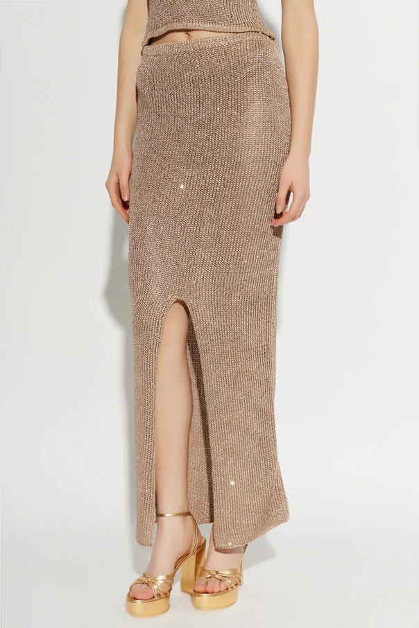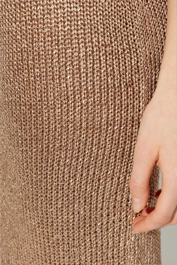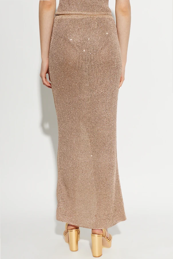 Spódnica została wykonana z wysokogatunkowej dzianiny jedwabnej o wyrazistym splocie i złotym , dyskretnie połyskującym wykończeniu. O jej niepowtarzalności decyduje gładka struktura bez zbędnych ozdób – to uniwersalny symbol ponadczasowej elegancji i luksusu.