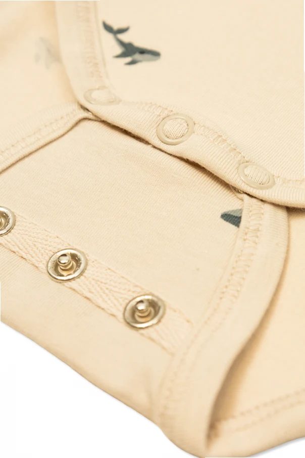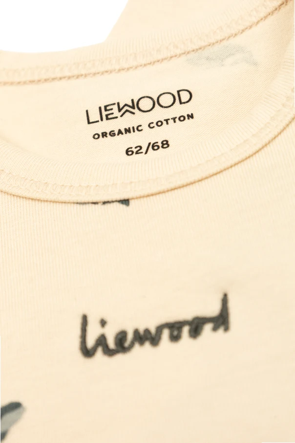 Cechą wyróżniającą są subtelne, powtarzające się grafiki dinozaurów na kremowym tle, utrzymane w gustownych, stonowanych barwach. Praktyczne metalowe napy w kroku oraz dodatkowe zapięcie na ramieniu gwarantują wygodę podczas przewijania i ubierania maluszka. Elegancji całości dopełnia finezyjne logo projektanta – odręczny podpis Liewood, dyskretnie umieszczony na przodzie produktu oraz metce przy szyi.
