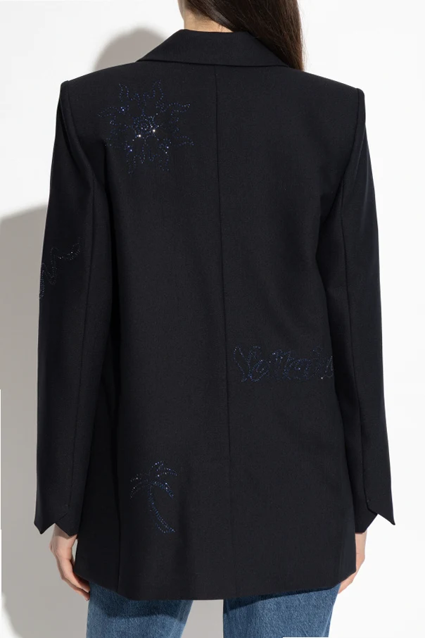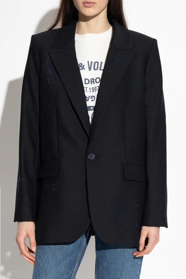 Uszyta z gładkiej, matowej tkaniny zachwyca szlachetną strukturą i doskonałym układem, podkreślającym czarny kolor ubrania. Unikatowego wymiaru dodają marynarce dyskretne, wyszywane motywy gwiazd ciemnoniebieską nicią, rozmieszczone na klapach, rękawach, dolnej części oraz plecach. Wyjątkową uwagę przykuwa również subtelny napis „Voltaire” umieszczony z tyłu, będący esencją kunsztu projektanta.