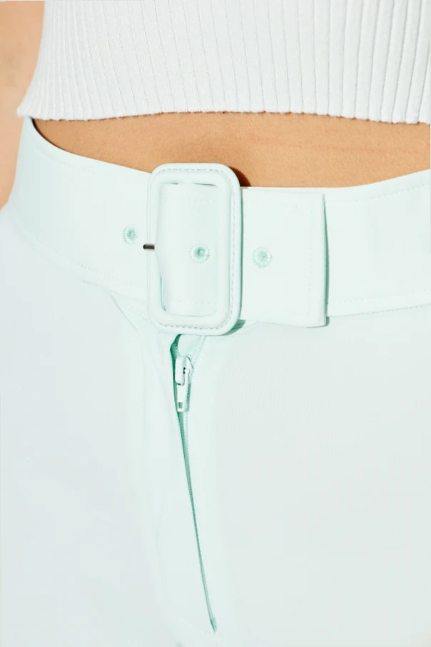 Jasnoniebieski odcień podkreśla szlachetność materiału – gładkiego, elastycznego, znakomicie przylegającego do ciała, typowego dla odzieży luksusowej. Oryginalności dodaje szeroki, dekoracyjny pasek z okazałą klamrą oraz praktyczny zamek błyskawiczny z przodu, które podkreślają funkcjonalność produktu. Brak widocznych wzorów i zdobień skupia uwagę na architektonicznej formie i wyjątkowej jakości wykończenia.